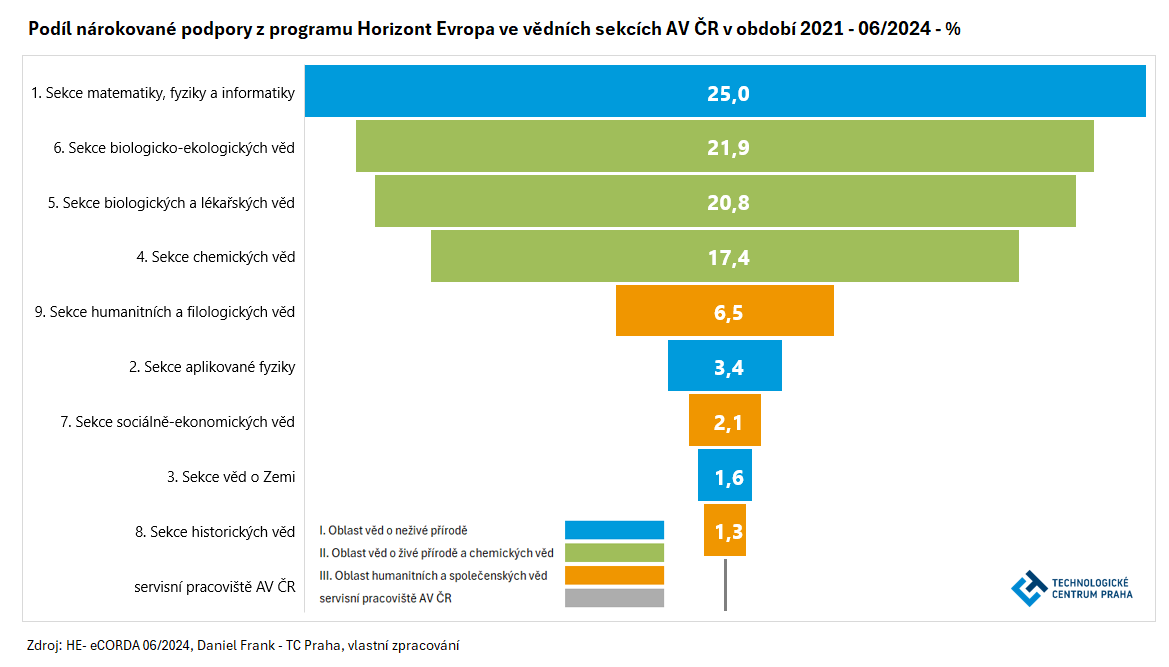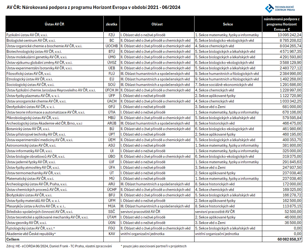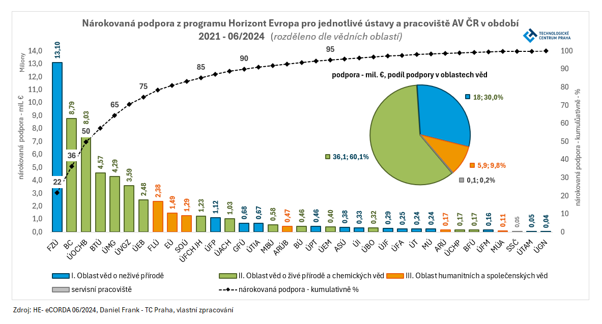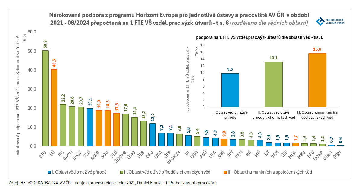 Nejúspěšnějšími ústavy AV ČR jsou v programu Horizont Evropa FZÚ z oblasti věd o neživé přírodě, dalších 6 ústavů z oblasti věd o živé přírodě a chemických věd – BC, ÚOCHB, BTÚ, ÚMG, ÚVGZ a ÚEB, které dohromady dosahují 75 % celkové finanční podpory určené pro AV ČR. To znamená, že 3/4 celkové finanční podpory pro AV ČR z programu HE putuje jen do sedmi jejích ústavů.