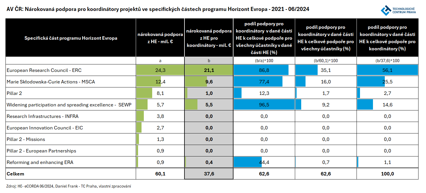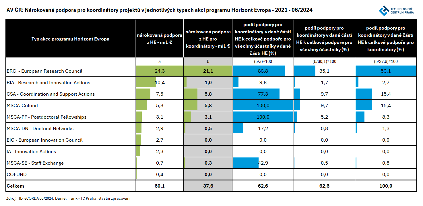 AV ČR získává díky koordinaci projektů cca 2/3 (37, 6 mil. €, 62,6 %) celkové podpory z programu HE. Koordinace projektů programu Horizont Evropa ze strany AV ČR se týká z velké části individuálních projektů (ERC, MSCA – PF, MSCA – Cofund). Koordinace konsorciálních projektů se z velké části omezuje na projekty CSA zejména v prioritě Widening. Na koordinaci konsorciálních projektů s vyššími výzkumnými a inovačními ambicemi RIA – jde pouhý 1 mil. € - 1,7 % celkové podpory pro AV ČR.