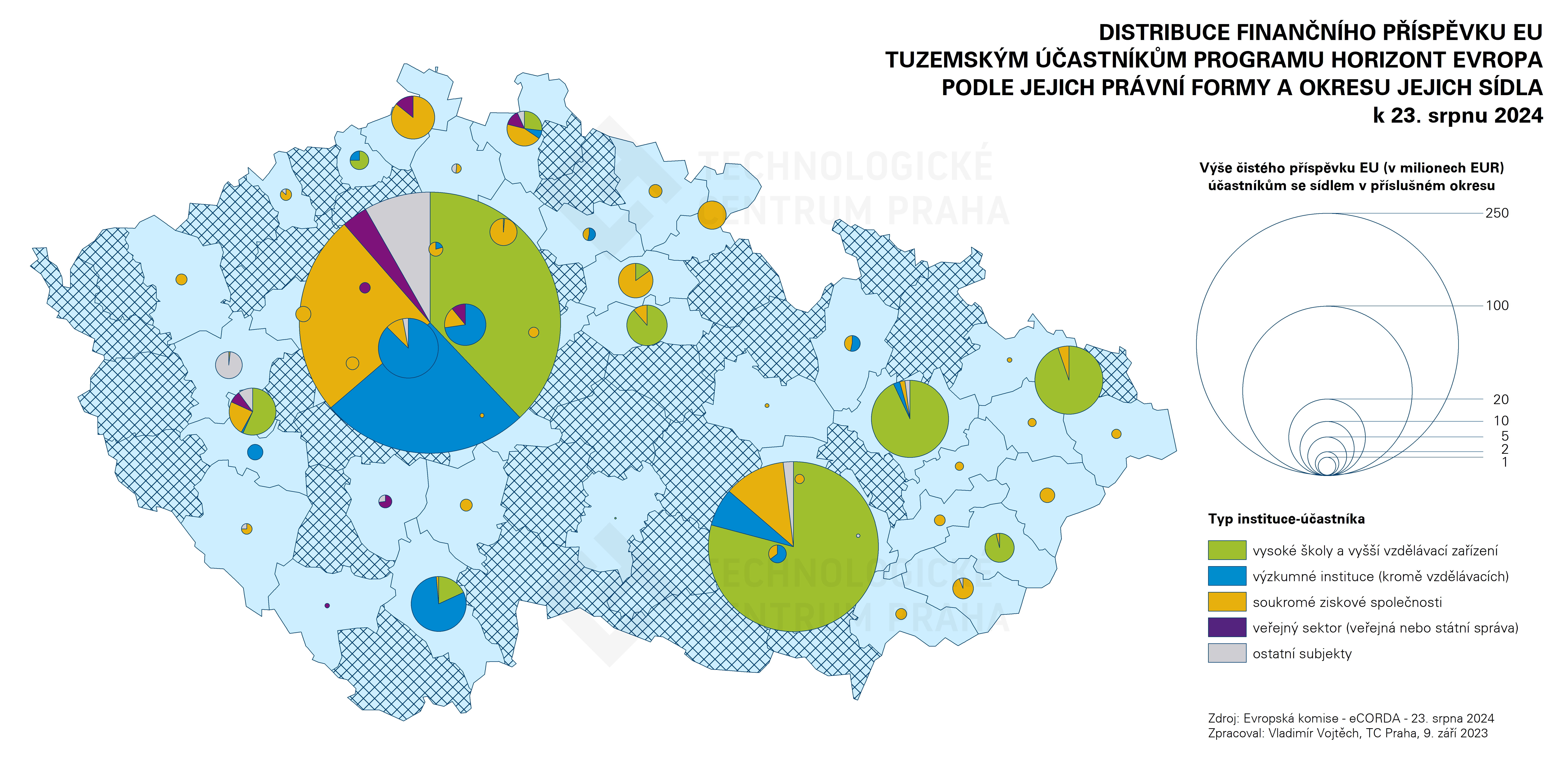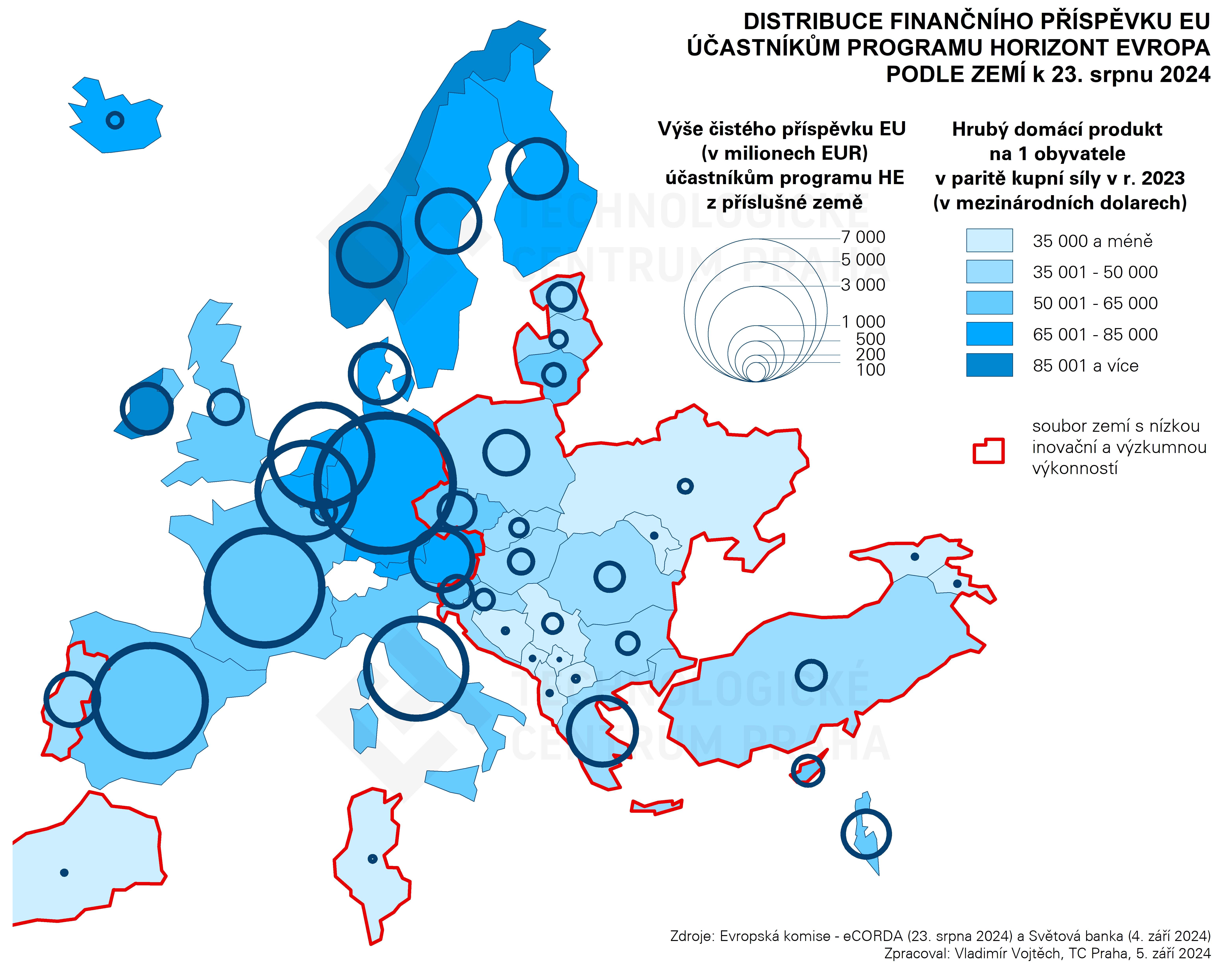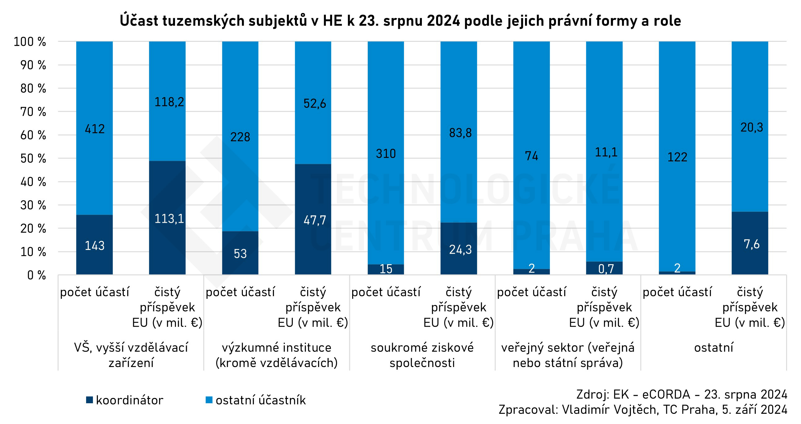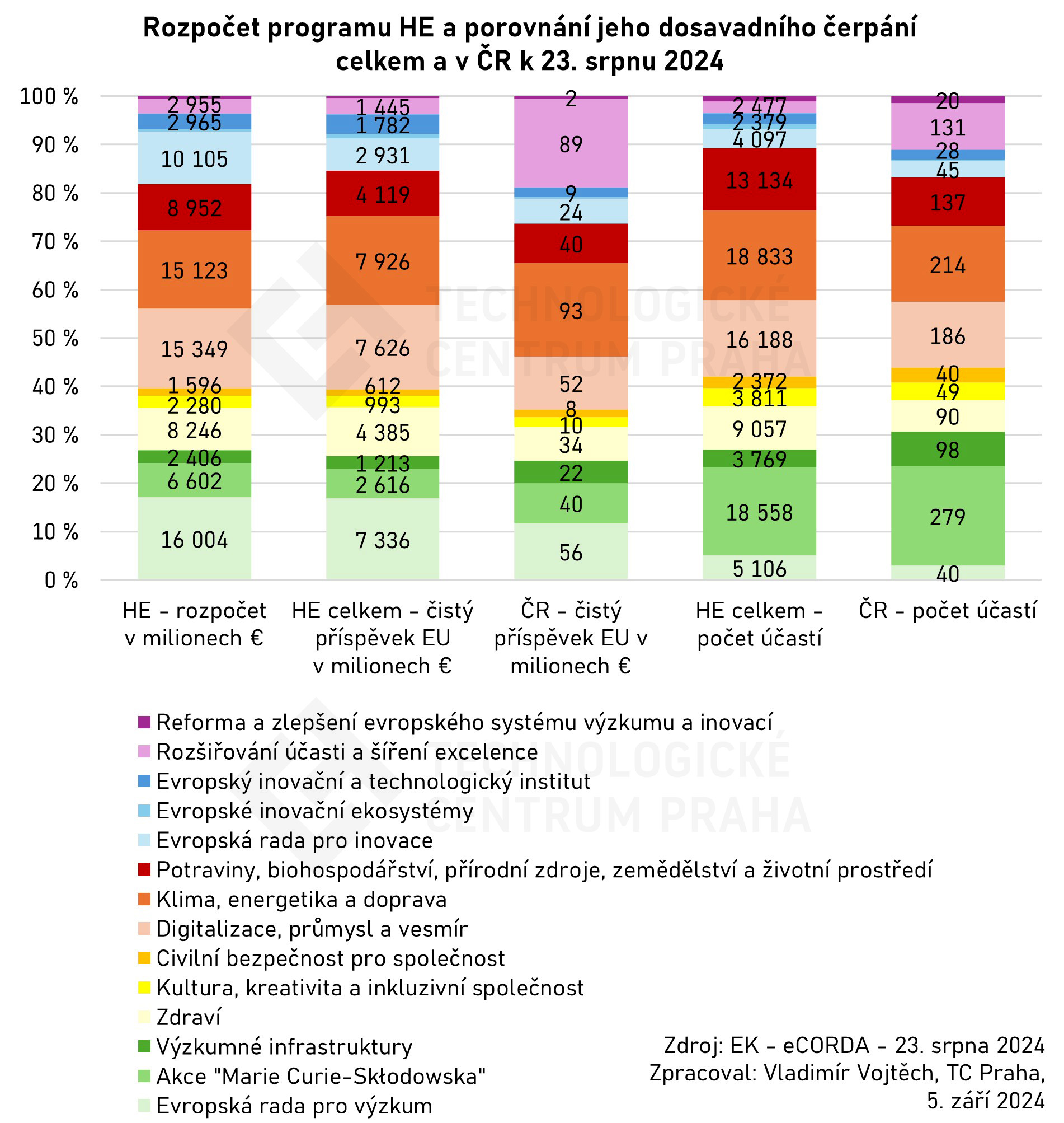 K 23. srpnu 2024 databáze Evropské komise eCORDA evidovala pro Českou republiku 1 361 financovaných účastí v 956 projektech programu Horizont Evropa (dále jen „HE“). K témuž datu nárokovali tuzemští účastníci čistý příspěvek EU ve výši 479 milionů €. Mezi 45 členskými a k programu HE přidruženými zeměmi si ČR udržuje dlouhodobě 17. pozici, a to jak z hlediska počtu účastí, tak z hlediska čistého příspěvku EU. Pro srovnání: Polsko je dlouhodobě v obou ukazatelích 16. (1 838 účastí s celkovým nárokovaným čistým příspěvkem EU 668 mil. €), Slovinsko je v účasti 18. (1 115 účastí), v nárokovaných finančních prostředcích EU 19. (357 mil. €). Pořadí ČR, ale i Polska či Slovinska, zcela odpovídá celkové ekonomické výkonnosti těchto zemí – v ukazateli HDP na obyvatele v paritě kupní síly byla ČR v r. 2023 (podle údajů Světové banky) mezi členskými zeměmi EU a k programu HE přidruženými zeměmi 19., Slovinsko 18.