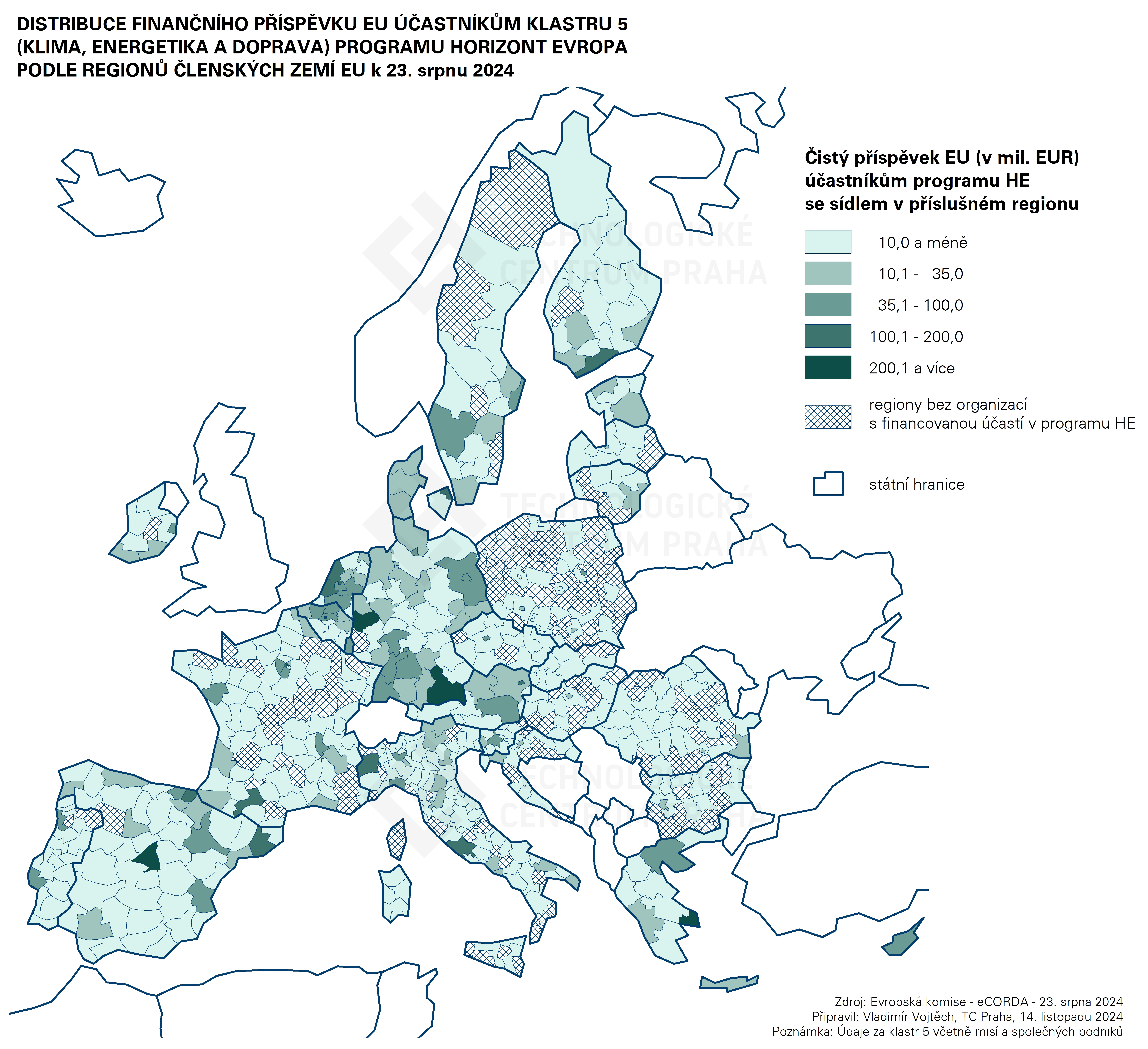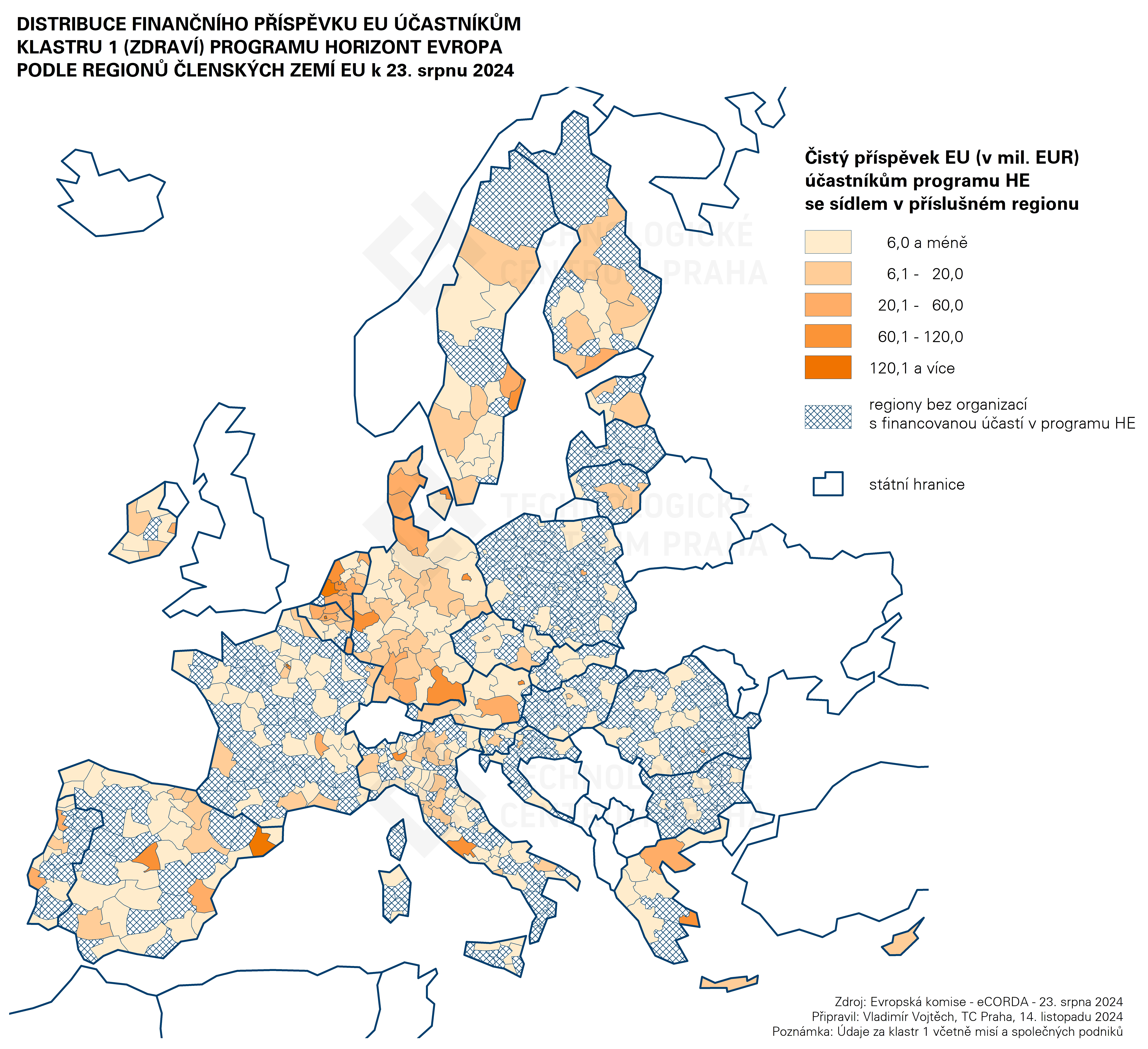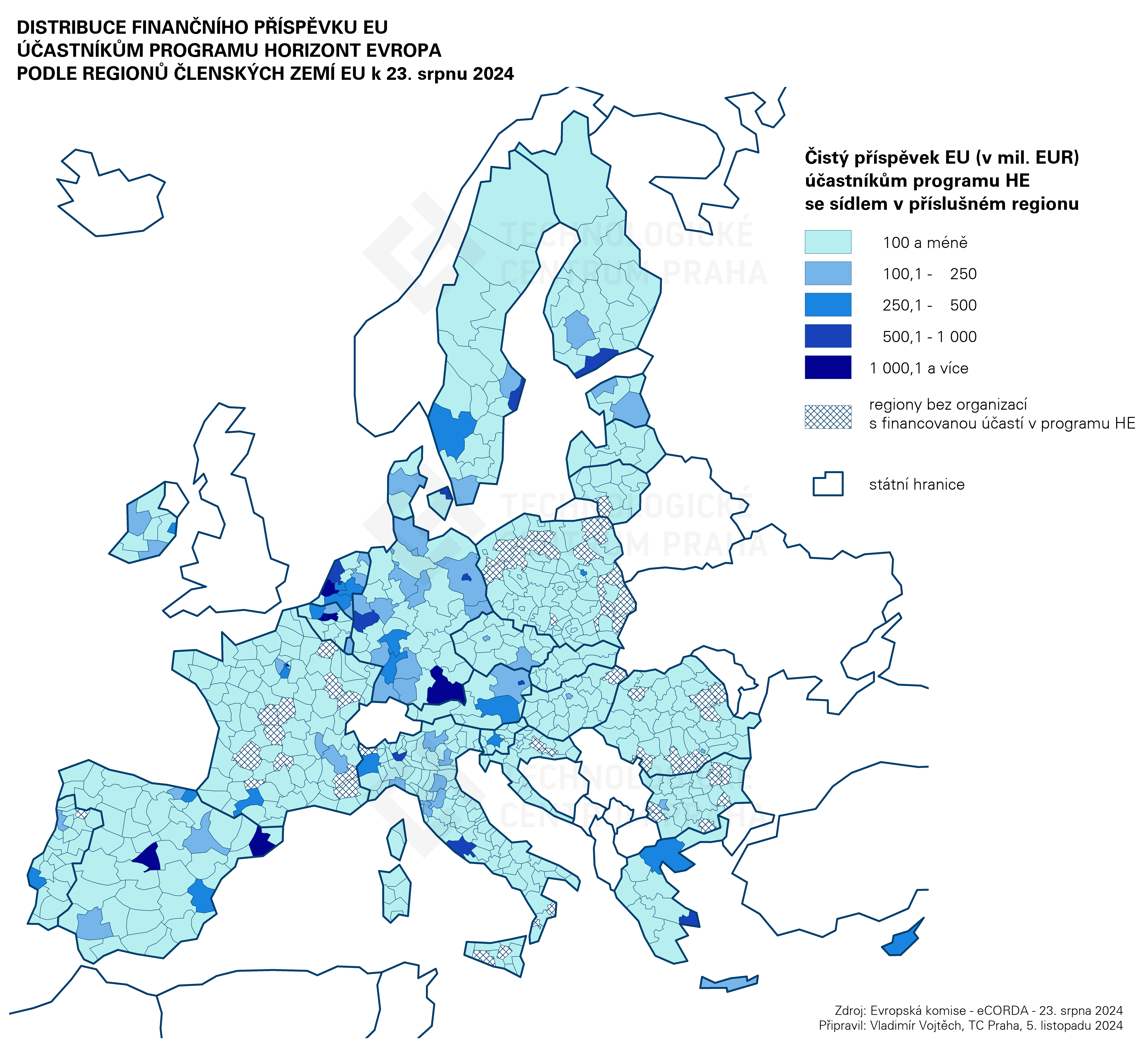 Doposud jsme v programu Horizont Evropa hodnotili účast za jednotlivé země. Podívejme se proto hlouběji na účast jednotlivých regionů členských zemí EU. Připravili jsme pro vás 7 mapových výkresů – první pro celý RP Horizont Evropa, dalších 6 pro jednotlivé klastry II. pilíře RP. Z výkresů se např. dozvíte, že nejvyšší příspěvek EU (k 23. srpnu 2024) nárokují účastníci z největších měst jakožto přirozených center výzkumu, vývoje, inovací, podnikání a kulturního života. Na prvním místě se z regionů EU umístila Paříž (3,6 tis. financovaných účastí s nárokovaným čistým příspěvkem EU ve výši 2,3 mld. €), následovaná regiony Mnichova (Horní Bavory – 2,3 tis. financovaných účastí a 1,8 mld. €) a Barcelony (2,9 tis. financovaných účastí a 1,4 mld. €). Na čtvrtém místě se umístila zázemní provincie Bruselu Vlámské Brabantsko (1 tis. financovaných účastí a 1,3 mld. €). Více než 1 mld. € čistého příspěvku EU nárokovaly i subjekty přímo z Bruselu, madridského regionu a Jižního Holandska (region Rotterdamu a Haagu). Účastníci z uvedených 7 regionů nárokovali téměř čtvrtinu celkového čistého příspěvku EU.
