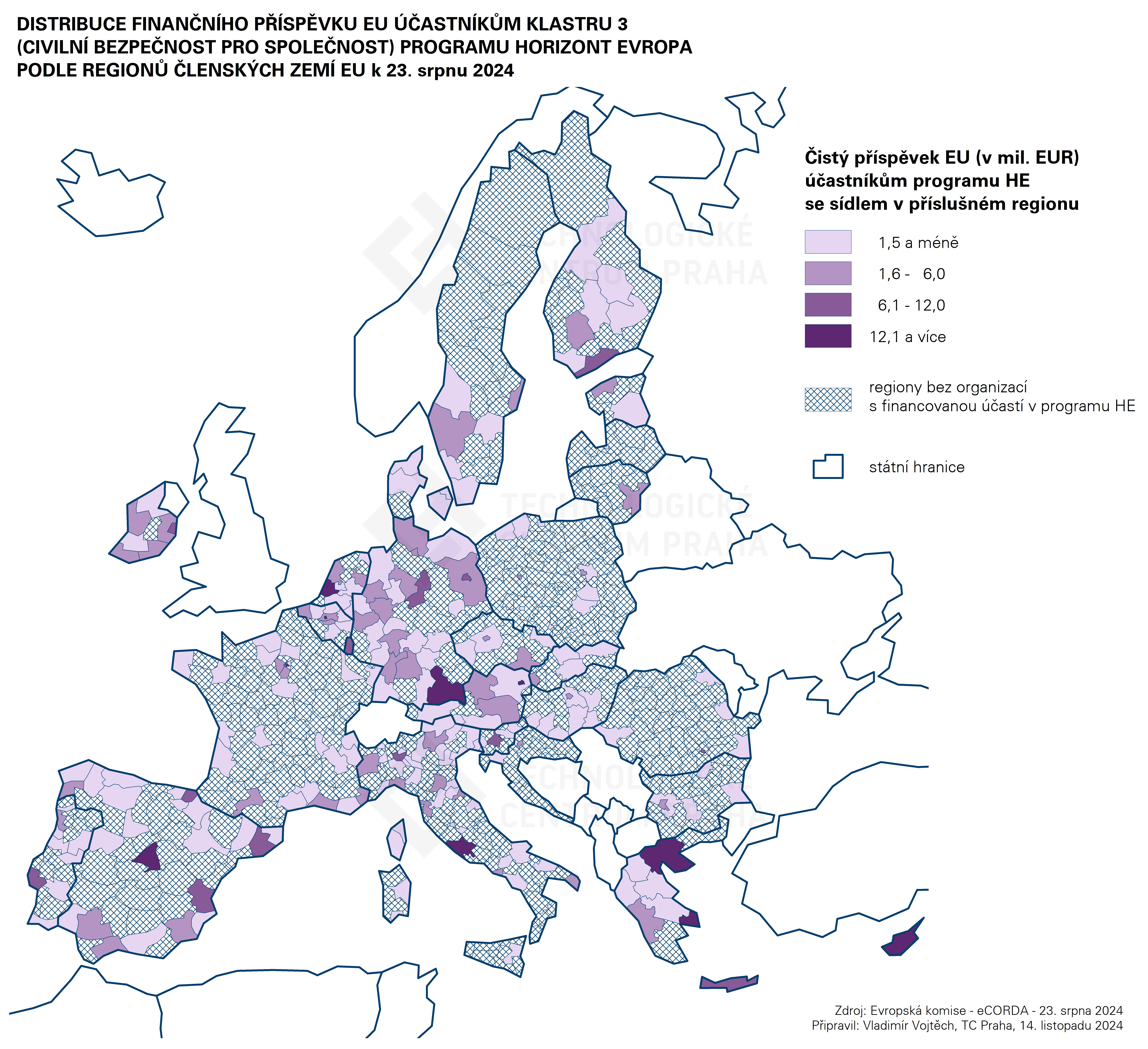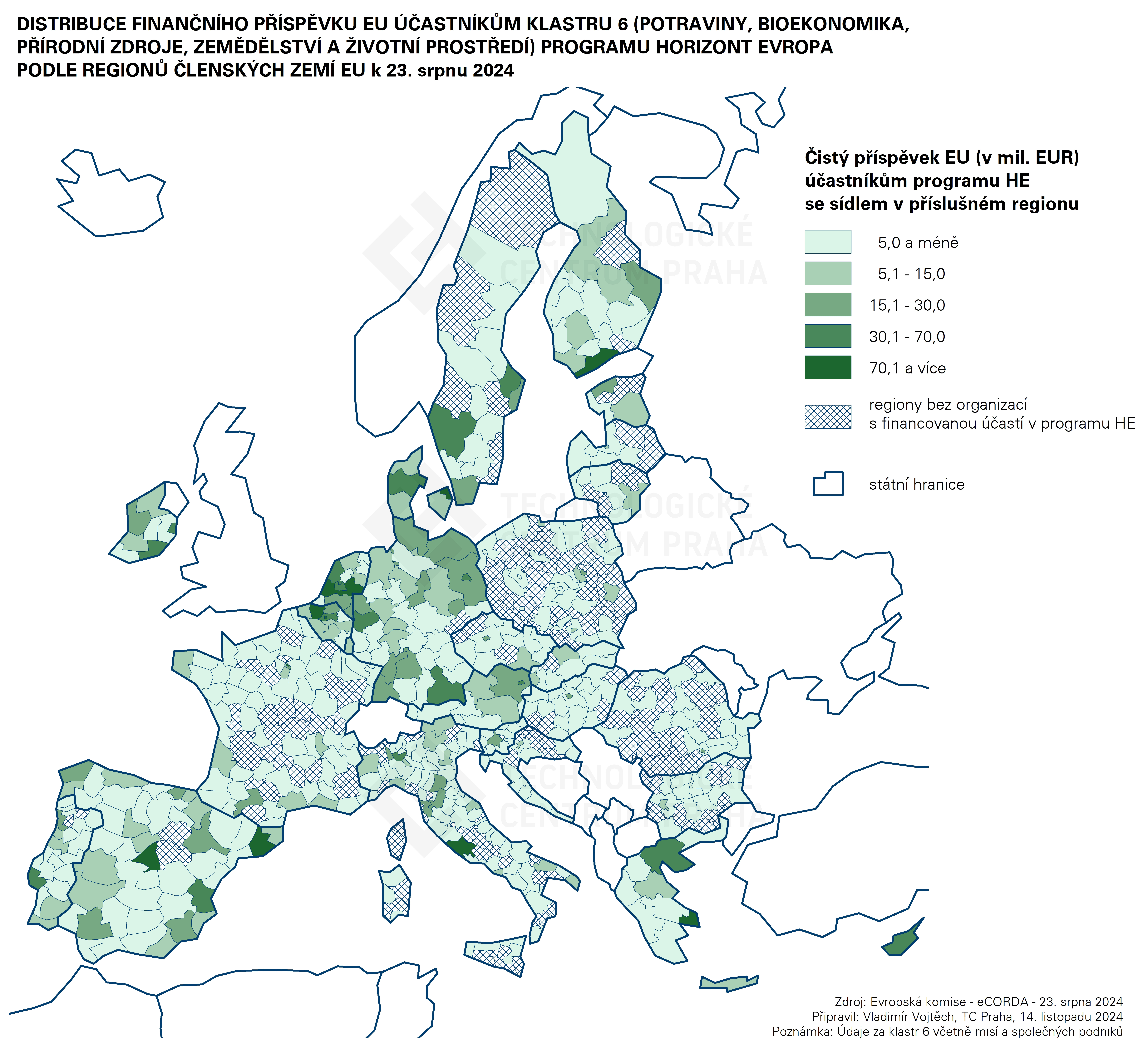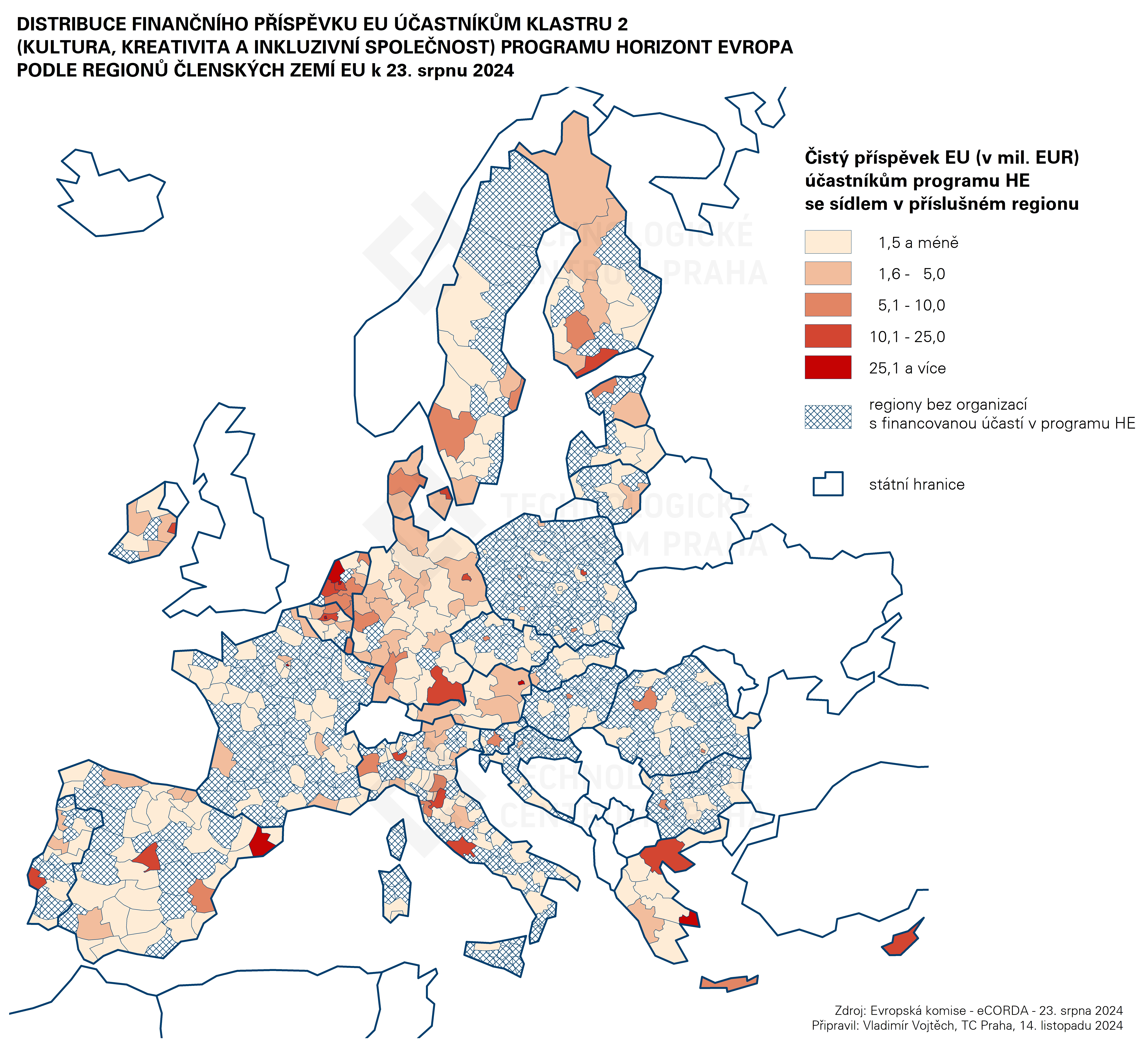Doposud jsme v programu Horizont Evropa hodnotili účast za jednotlivé země. Podívejme se proto hlouběji na účast jednotlivých regionů členských zemí EU. Připravili jsme pro vás 7 mapových výkresů – první pro celý RP Horizont Evropa, dalších 6 pro jednotlivé klastry II. pilíře RP. Z výkresů se např. dozvíte, že nejvyšší příspěvek EU (k 23. srpnu 2024) nárokují účastníci z největších měst jakožto přirozených center výzkumu, vývoje, inovací, podnikání a kulturního života. Na prvním místě se z regionů EU umístila Paříž (3,6 tis. financovaných účastí s nárokovaným čistým příspěvkem EU ve výši 2,3 mld. €), následovaná regiony Mnichova (Horní Bavory – 2,3 tis. financovaných účastí a 1,8 mld. €) a Barcelony (2,9 tis. financovaných účastí a 1,4 mld. €). Na čtvrtém místě se umístila zázemní provincie Bruselu Vlámské Brabantsko (1 tis. financovaných účastí a 1,3 mld. €). Více než 1 mld. € čistého příspěvku EU nárokovaly i subjekty přímo z Bruselu, madridského regionu a Jižního Holandska (region Rotterdamu a Haagu). Účastníci z uvedených 7 regionů nárokovali téměř čtvrtinu celkového čistého příspěvku EU.