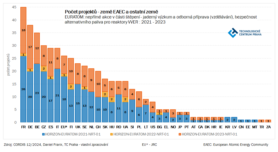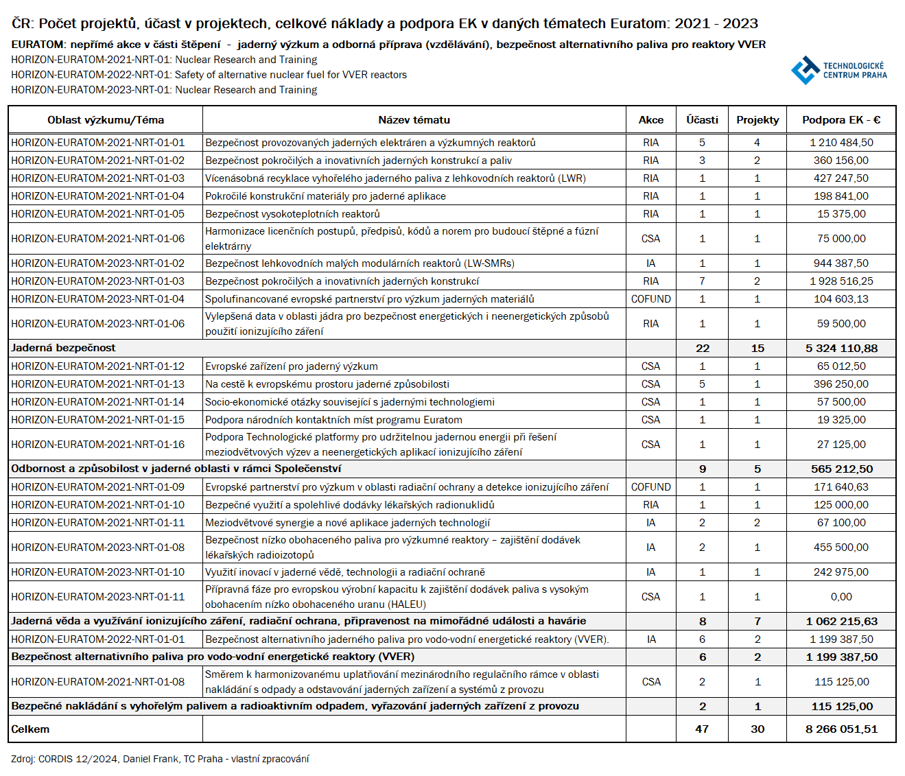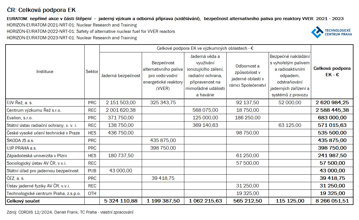 Prostřednictvím výše uvedených výzev bylo vybráno k financování 51 projektů, na jejichž řešení EK poskytla finanční podporu ve výši 238 mil. €. Výzkumné instituce z ČR se účastní 30 projektů, tj. téměř 2/3 všech financovaných. Finanční podpora pro ČR z daných výzev programu Euratom dosáhla výše 8,3 mil. €. Významné postavení ČR v programu Euratom dokládají její podíly účasti v tomto programu, které jsou násobně vyšší než v případě programu Horizont Evropa. Zatímco v programu Horizont Evropa tvoří české výzkumné týmy cca 1,4 % všech zúčastněných týmů, v programu Euratom (nepřímé akce, štěpení) je to 5,0 %. V programu Horizont Evropa překračuje podíl získané podpory pro ČR 1 % (přesněji 1, 12 %), v programu Euratom je tento podíl 3 x vyšší - 3, 5 %. V programu Horizont Evropa se ČR angažuje v 6 % financovaných projektů, v programu Euratom je to 10 x více – v 60 % projektů. Samozřejmě lze namítat, že programy Horizont Evropa a jeho kompletního partnera program Euratom nelze jednoduše porovnávat co do velikosti rozpočtu, rozsahu výzev a témat a počtu zúčastněných států, ale i tak je postavení ČR mezi 36 státy, které se účastní sledovaných výzev v programu Euratom významné.