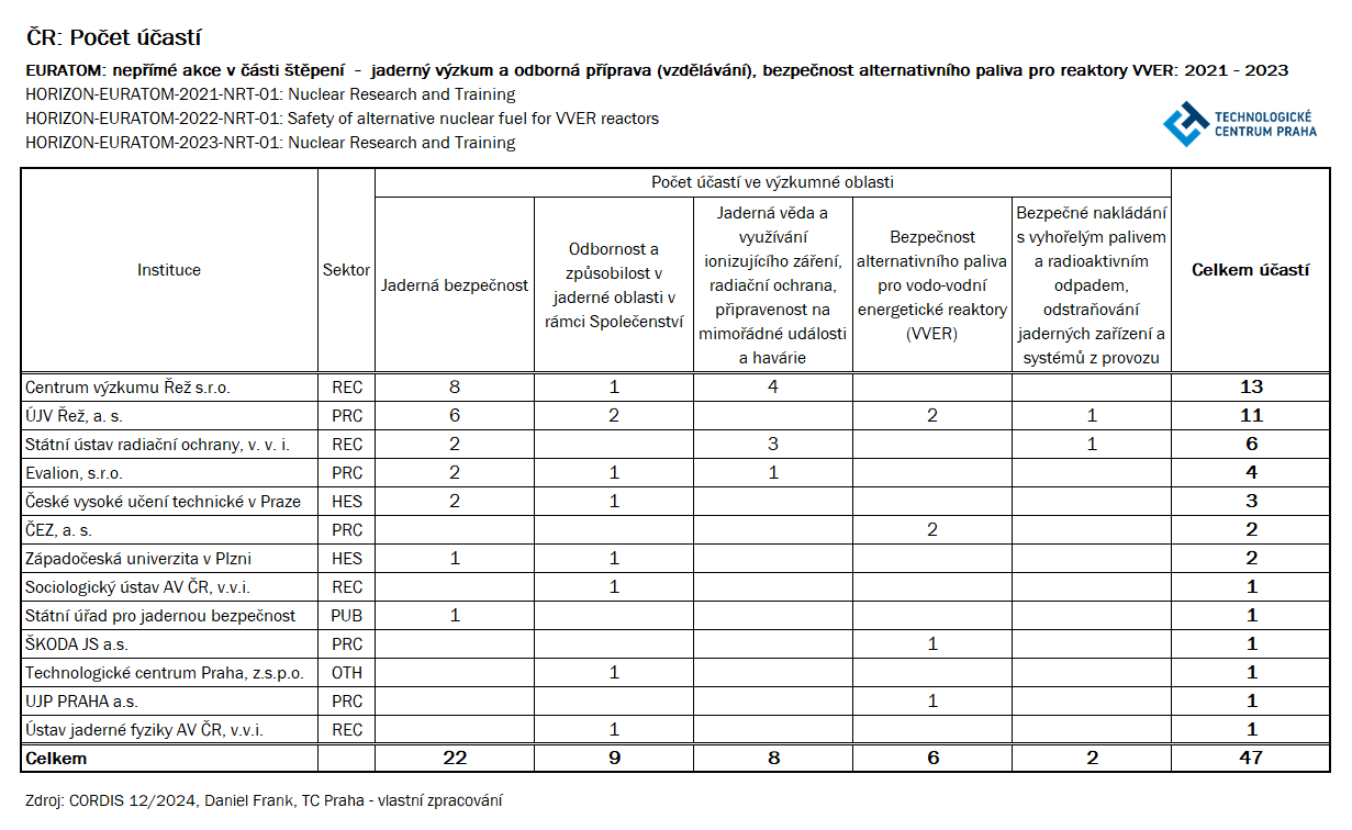 Z ČR je ve sledovaných výzvách celkově nejúspěšnější Centrum výzkumu Řež, které má kromě jedné koordinace ještě dalších dvanáct účastí v projektech těchto výzev. Následuje ÚJV Řež, a. s., s jedenácti účastmi a Státní ústav radiační ochrany se šesti účastmi. Čtyři účasti vykazuje Evalion, s. r. o., a tři účasti České vysoké učení technické v Praze. Po dvou účastech mají ČEZ, a.s. a Západočeská univerzita v Plzni. Podrobněji prezentují účast českých institucí v jednotlivých oblastech výzkumu tabulky 3 a 4.