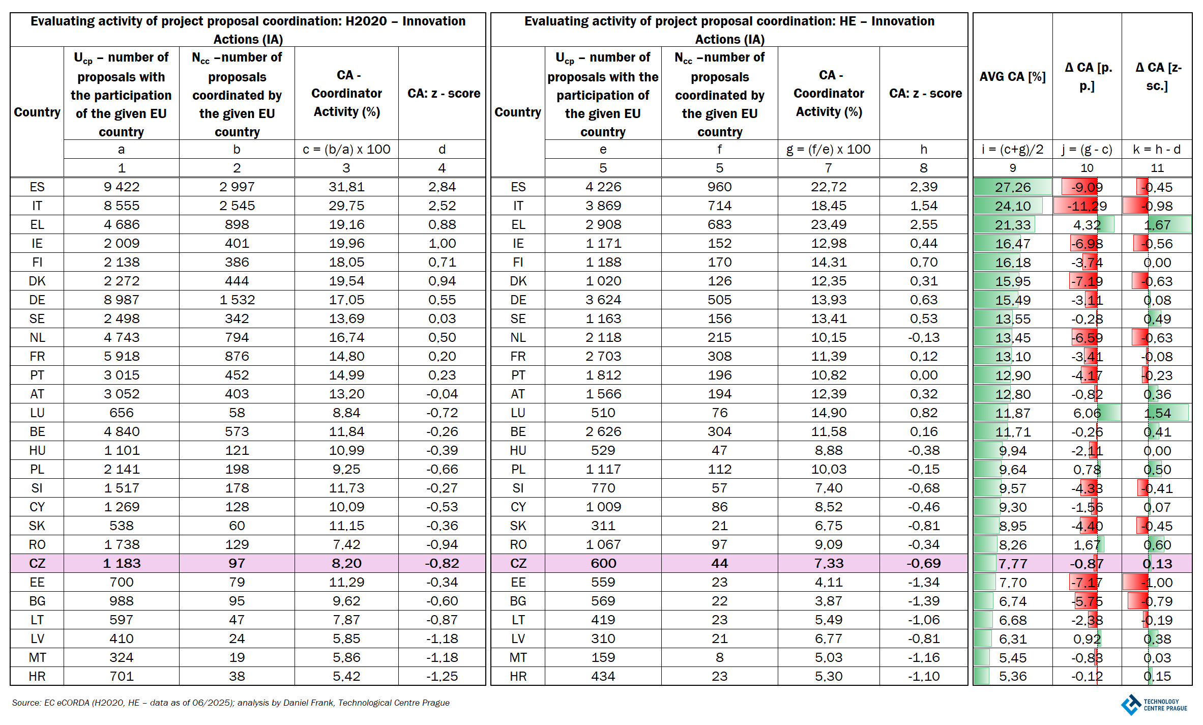 Z-skóre koordinační aktivity CA normalizuje absolutní hodnoty tohoto ukazatele vůči rozptylu u všech států EU, takže říká, o kolik směrodatných odchylek  je daná země nad nebo pod průměrem EU. ČR má z-skóre -0,82 v programu H2020 a -0,69 v programu HE (tabulka 2, sloupce 3, 4), tj. pod průměrem EU u obou programů, ale v programu HE se ČR v koordinaci projektových návrhů IA daří mírně lépe než v programu H2020, protože se  záporné z-skóre zmírnilo, což znamená, že ČR svou relativní pozici v EU přiblížila k unijnímu průměru.