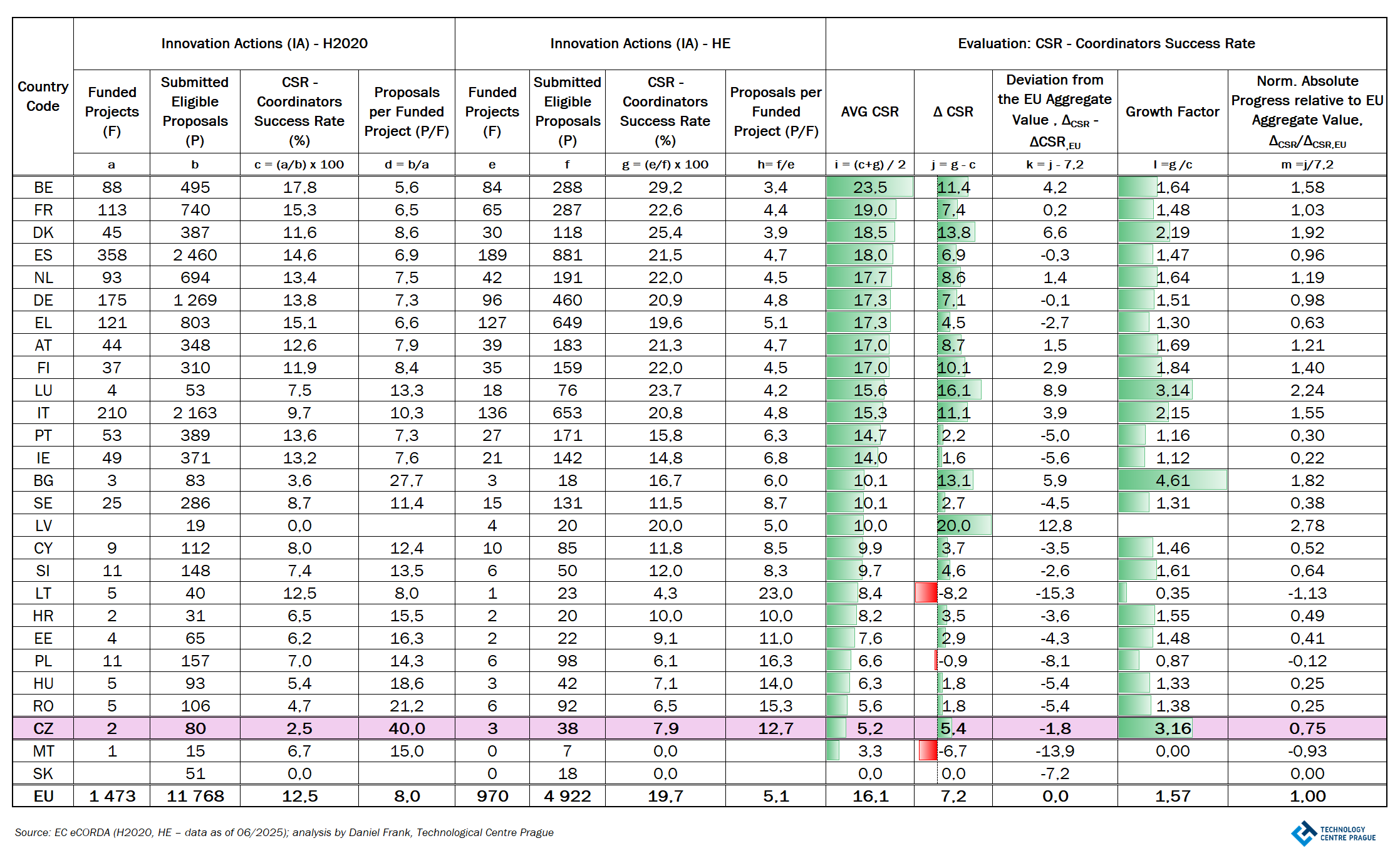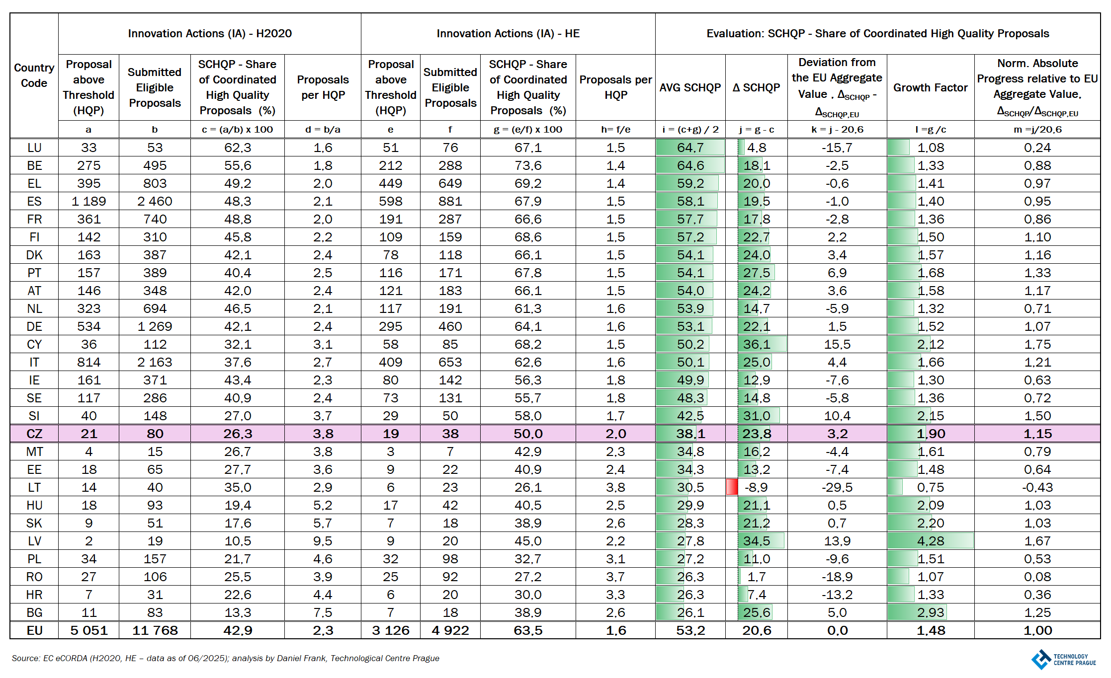 Podle z-skóre (kde je průměr EU nastaven na "0" a jedna směrodatná odchylka odpovídá = 1) se ČR v programu H2020 pohybovala z hlediska SCHQP zhruba 0,69 směrodatné odchylky pod evropským průměrem. V programu HE se jí však podařilo tuto mezeru stáhnout na pouhých 0,26  směrodatné odchylky – tedy o velmi pozoruhodných 0,43 směrodatné odchylky, což představuje šestý nejdynamičtější růst ze všech 27 členských států. Tento pokrok posunul ČR z „dolní čtvrtiny“ členských zemí EU téměř do jejich středu. I když ČR setrvává hodnotou z-skóre lehce pod evropským průměrem, tempo, jakým se zlepšuje kvalita projektových návrhů typu IA připravovaných českými koordinátory, je výrazně nad průměrem EU a dává reálnou šanci, že v dohledné době tuto hranici překročí a začne se prosazovat mezi lídry.