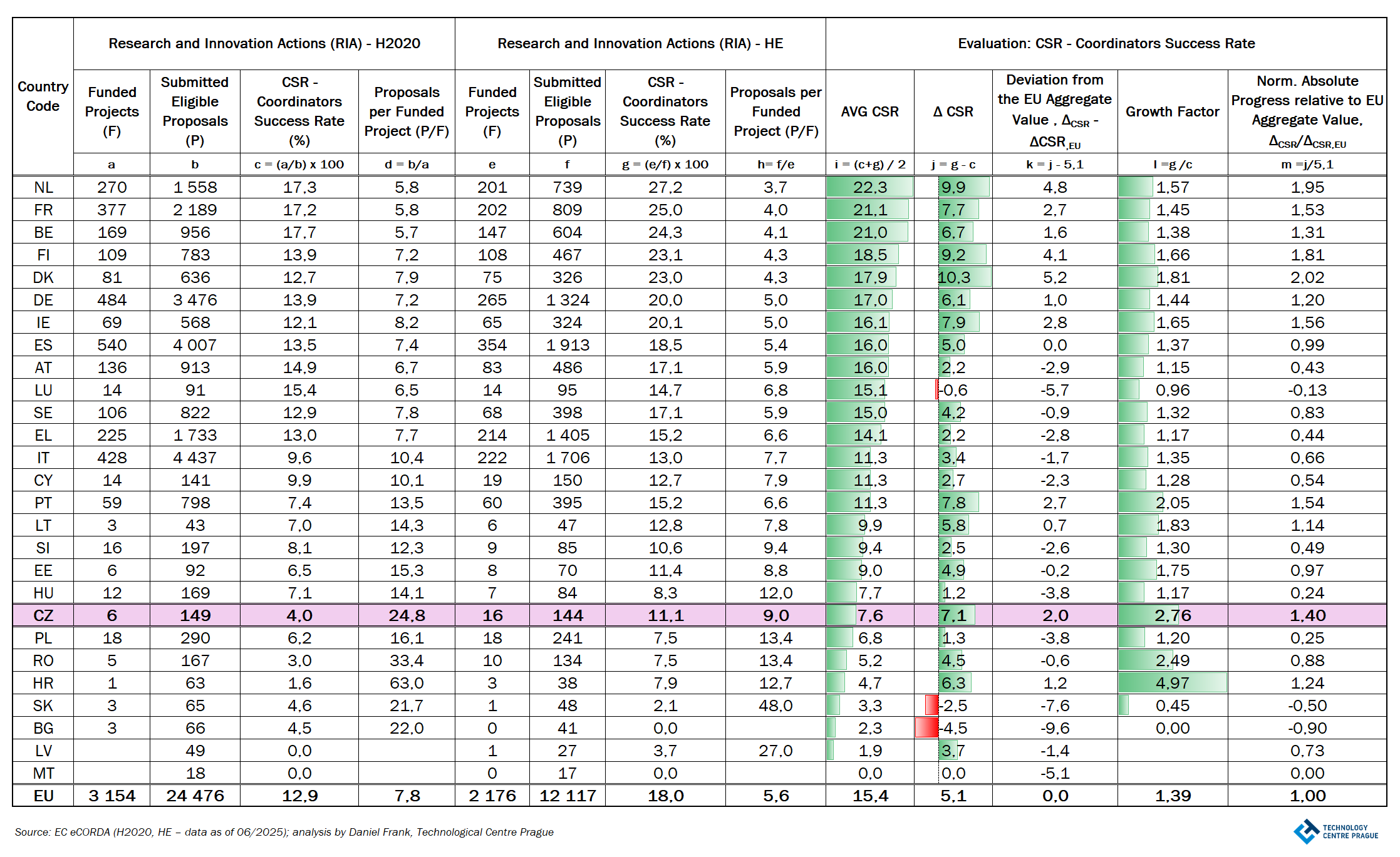 V dosavadním průběhu programu HE dokázala ČR zvýšit počet koordinovaných projektů typu RIA téměř 2,7 krát (HE:16 vs. H2020: 6), při téměř stejném počtu podaných projektových návrhů (HE: 144 vs. H2020:149), přičemž v případě programu HE se pohybujeme teprve v jeho pátém roce trvání. Úspěšnost českých koordinátorů se v programu HE téměř ztrojnásobila: H2020 - 4,0 %, HE – 11,1 %, absolutní nárůst o 7,1 p. b., relativní růst (GF) – 2,8 krát. Hodnota absolutního nárůstu úspěšnosti nad 7 % řadí ČR mezi zeměmi na 7. místo. Pro porovnání souhrnná úspěšnost  koordinátorů projektových návrhů RIA ze všech států EU se v programu Horizont Evropa zvýšila 1,4 krát z 12,9 % v programu H2020 na 18 % v programu HE. Přestože hodnota úspěšnosti českých koordinátorů dosáhla v programu HE dvojciferné hodnoty, stále poměrně zaostává za unijní úrovní.
