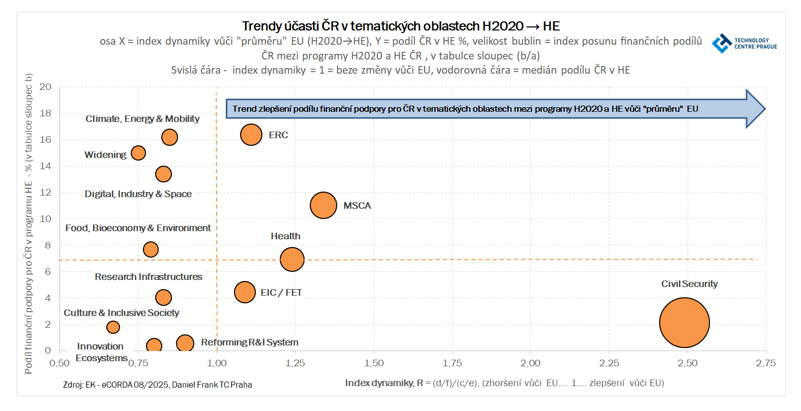 Výše uvedený graf ukazuje na vodorovné ose změnu postavení ČR vůči EU mezi programy H2020 a HE a na svislé ose podíl finační podpory pro ČR v tematických oblastech programu HE . Vodorovná osa představuje tzv. index dynamiky R = (d/f)/(c/e). Hodnota R = 1 (svislá oranžová čára) znamená, že se postavení ČR vůči EU nezměnilo; R > 1 značí zlepšení, R < 1 zhoršení. Svislá osa zobrazuje podíl ČR v programu HE v dané tematické oblasti; vodorovná oranžová čára vyznačuje medián tohoto podílu napříč tematickými oblastmi.