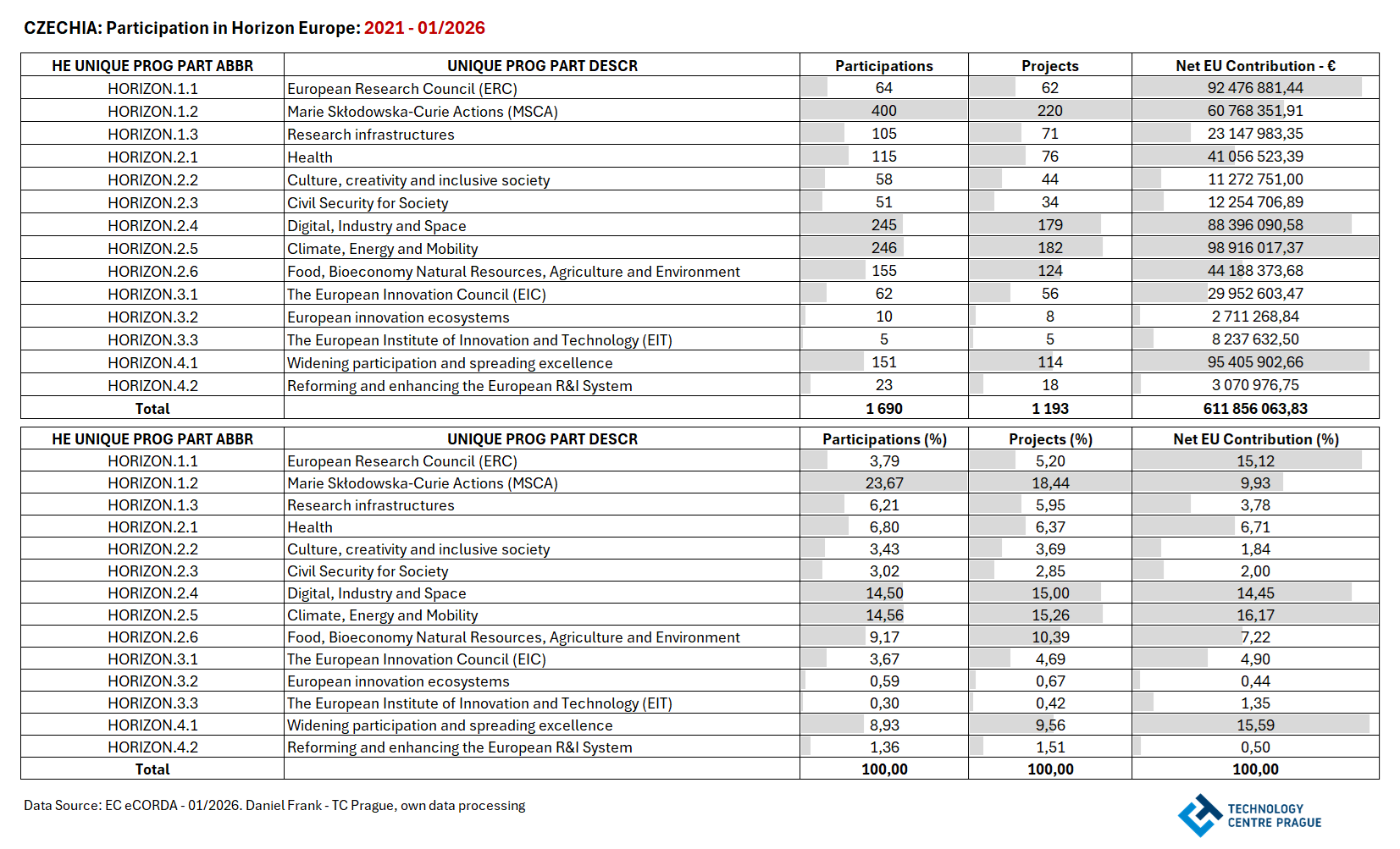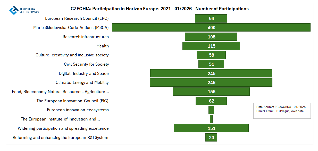 Po dvou obsáhlých analýzách TC Praha vztahujících se k prioritám prvního pilíře programu Horizont Evropa (ERC granty v ČR 2007–2025: vývoj a trendy, Korespondenční analýza MSCA: od individuální mobility k vedení sítí a programů) vám na přelomu ledna a února přinášíme obvyklý přehled dosavadní účasti ČR v tomto RP.