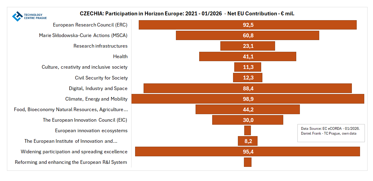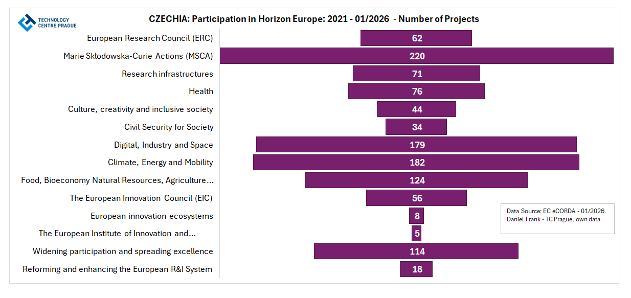 Podle lednové verze databáze eCORDA z roku 2026 dosáhla ČR celkem 1  690 účastí ve 1  193 projektech a získala čistý příspěvek z rozpočtu programu Horizont Evropa ve výši 611,9 mil. €.  ČR je v pořadí podle objemu získané finanční podpory na 18. místě mezi 46 sledovanými zeměmi. V počtu účastí jí náleží rovněž 18. místo.