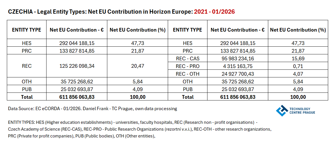 Největší podíl z celkového objemu finančních prostředků programu Horizont Evropa určeného pro ČR vykazují VŠ a fakultní nemocnice (HES: 47,7 %, 292,0 mil. € ) a privátní podniky (PRC: 21,9 %, 133, 8 mil. €). AV ČR (REC - CAS) si dosud připisuje 15,7 % finančních prostředků určených pro ČR. Za pozornost stojí velmi nízká dosavadní účast tzv. rezortních výzkumných ústavů (REC-PRO: v. v. i. vně AV ČR) s méně než 1 % nárokované finanční podpory z programu Horizont Evropa pro ČR.