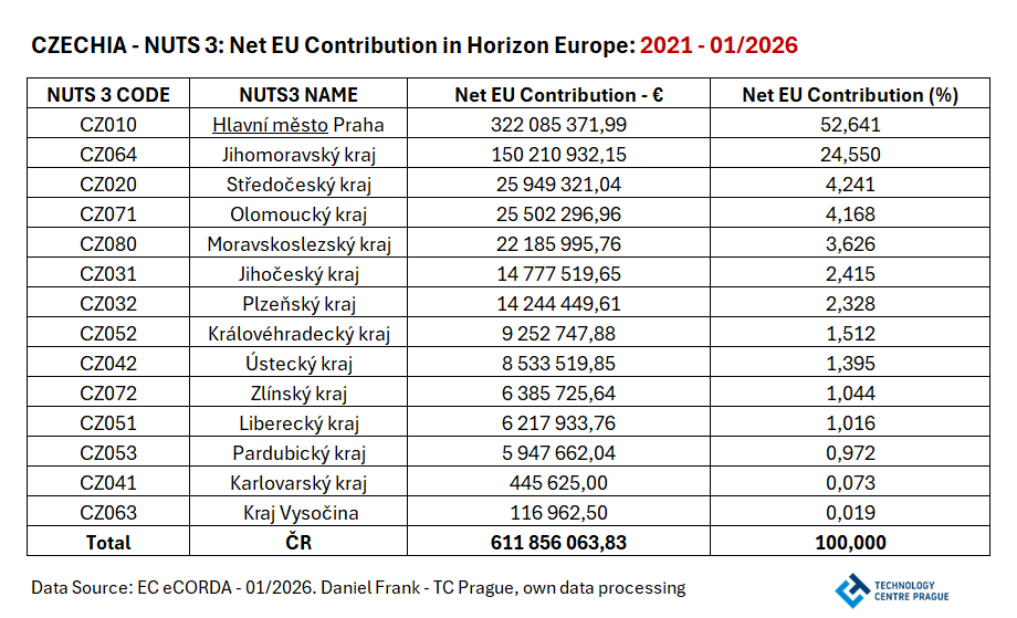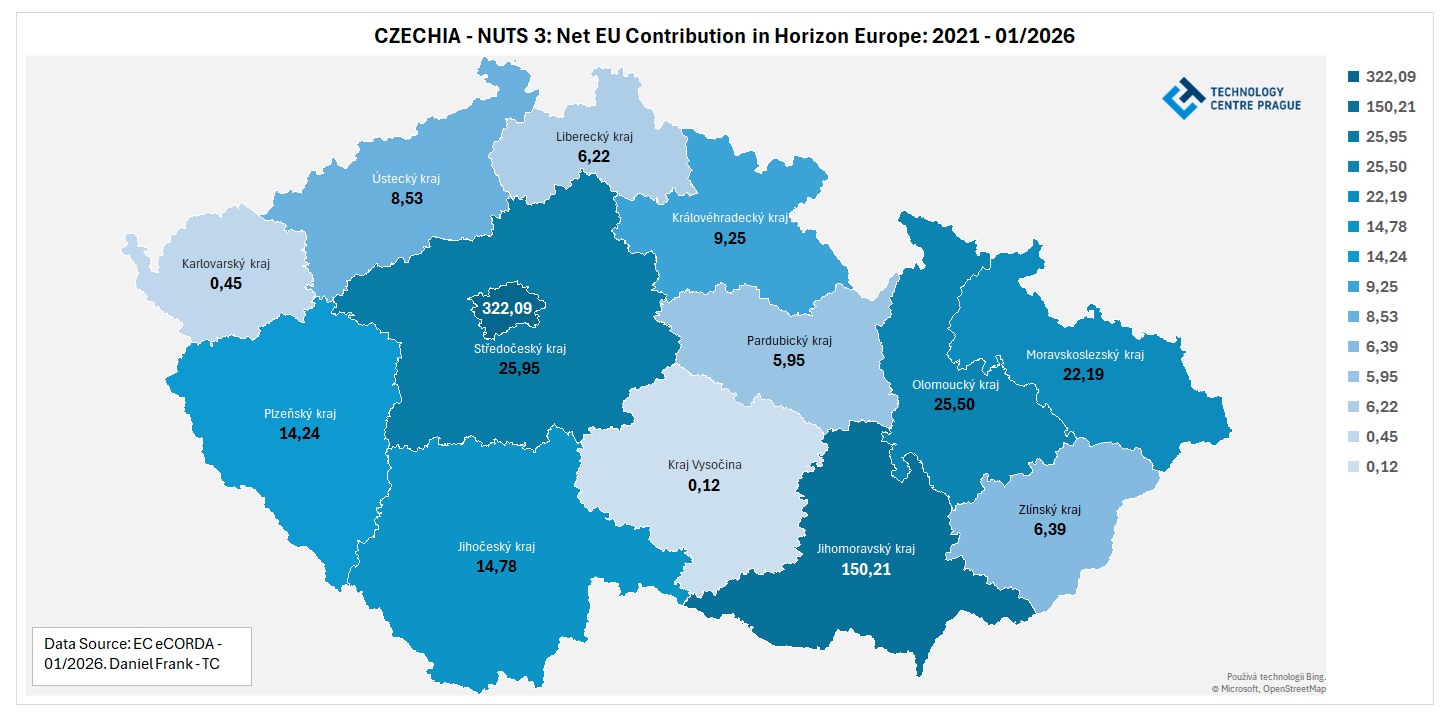 Distribuce finanční podpory v programu Horizont Evropa je v ČR tradičně velmi centralizovaná. Není proto překvapením, že největší objem finačních prostředků na řešení projektů programu Horizont Evropa se koncentruje v Praze a Brně - cca 77 %. Naopak instituce z Karlovarského kraje a Kraje Vysočina se nepřiblížily dosažení ani 1 % finančních prostředků z rozpočtu programu Horizont Evropa určených pro ČR.