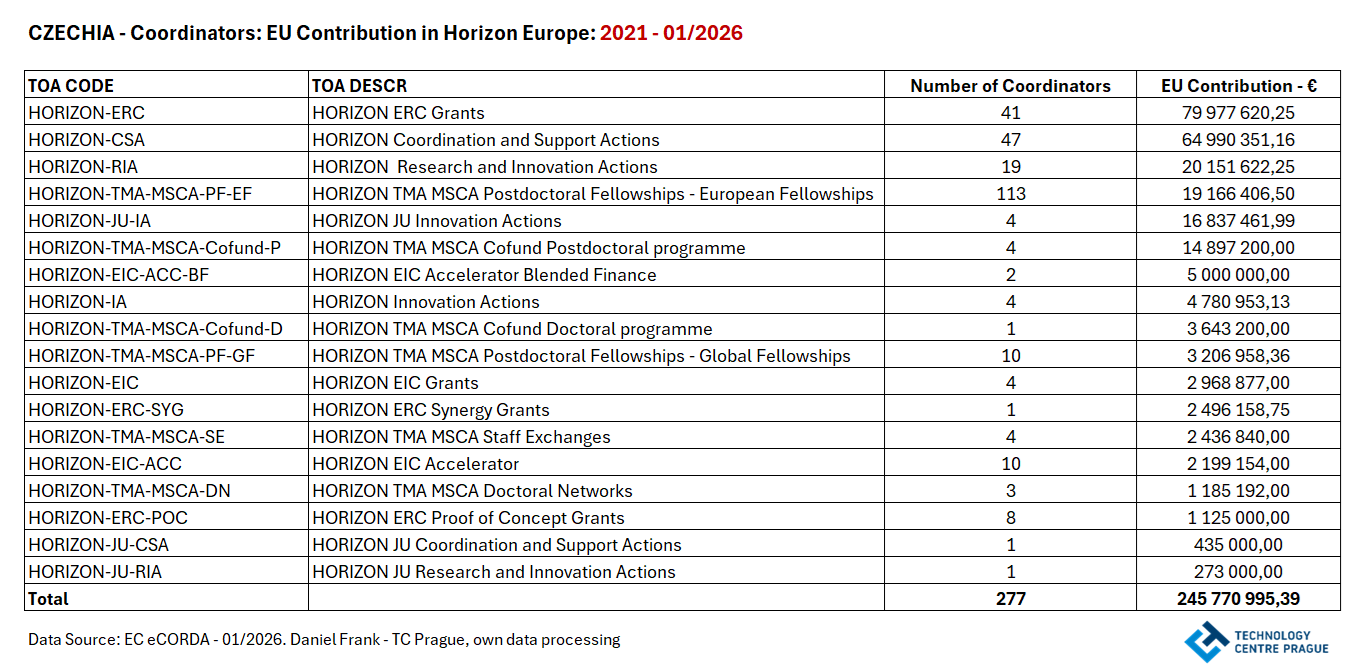 České subjekty nejčastěji koordinují individuální projekty, zejména postdoktorské granty MSCA a výzkumné granty ERC, které potvrzují kvalitu výzkumných institucí. Konsorciální projekty, jako jsou CSA nebo RIA, přinášejí významné prostředky a ukazují rostoucí schopnost českých organizací vést mezinárodní spolupráci. Inovačně orientované projekty (zejména JU-IA) jsou koordinovány méně často, ale s vysokým finančním přínosem. Prostřednictvím koordinace projektů získává ČR 40,2 % finančního příspěvku z programu Horizont Evropa určeného pro ČR. To podtrhuje strategický význam role koordinátorů, kteří nejen řídí projekty, ale zároveň zajišťují podstatnou část prostředků směřujících do ČR z tohoto programu.