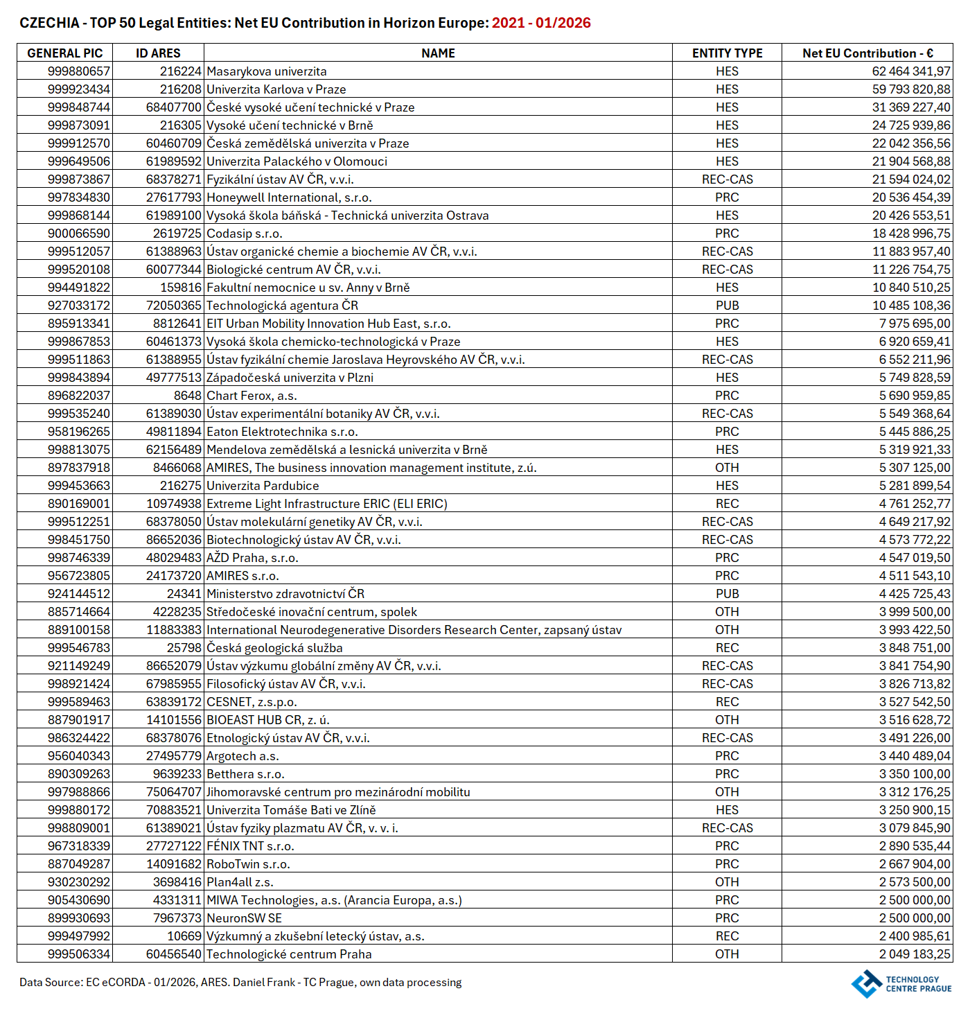 Na závěr této (z dostupných dat sestavené) stručné infografiky mapující současný stav účasti ČR v programu Horizont Evropa přikládáme přehled padesáti institucí z ČR, které získaly dosud nejvyšší podporu z tohoto RP. Dodejme, že do řešení projektů programu Horizont Evropa úspěšně zasáhlo 435 institucí z ČR a 343 z nich získalo z tohoto programu přímou finanční podporu (beneficiaries). Níže uvedených TOP50 institucí získalo cca 82 % dosavadní celkové finanční podpory z programu Horizont Evropa určené pro ČR.