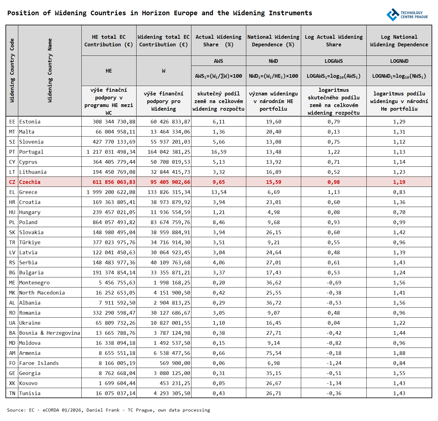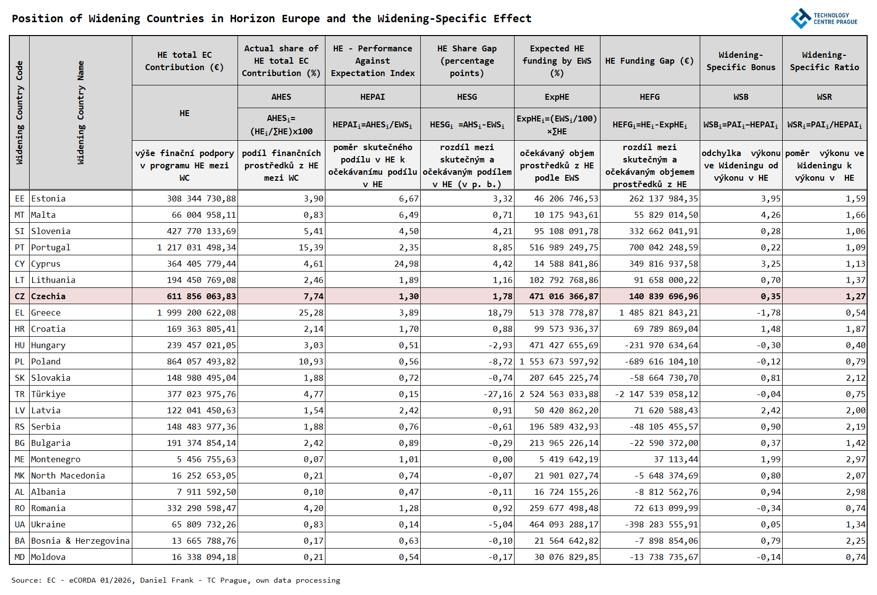Výše uvedené ukazatele potvrzují, že některé země získávají z nástrojů priority Widening výrazně více finančních prostředků, než by odpovídalo jejich výzkumné kapacitě a inovační pozici, zatímco jiné naopak výrazně méně. Mezi nejvýraznější případy nad očekáváním patří Portugalsko, Řecko, Estonsko, Kypr, Slovinsko a Česko; na opačném konci stojí zejména Turecko, Polsko, Ukrajina a Maďarsko. ČR přitom patří mezi zřetelně nadprůměrné země. Zatímco referenční rámec pro ni implikuje přibližně 58 mil. €, skutečně získala 95,4 mil. €, tedy zhruba o dvě třetiny více.