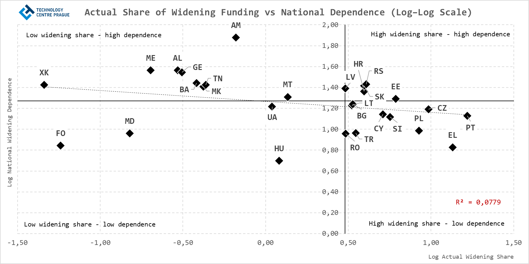Vztah mezi absolutní a relativní pozicí zemí ve Wideningu dále zpřesňuje log-log diagram založený na ukazatelích AWS a NWD. Graf potvrzuje pouze slabý vztah mezi oběma ukazateli: země s vyšším podílem na wideningovém rozpočtu nemusejí být zároveň na Wideningu relativně nejvíce závislé. Naopak menší nebo strukturálně slabší systémy mohou získávat relativně malý podíl z celkového wideningového rozpočtu, avšak Widening pro ně přesto představuje velmi významnou součást jejich celkové účasti v programu Horizont Evropa.