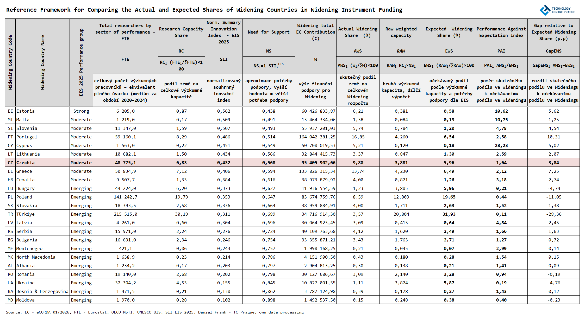Základní logika referenčního rámce vychází z předpokladu, že očekávatelný podíl země v prioritě Widening by měl odrážet dvě vzájemně propojené charakteristiky: velikost její výzkumné kapacity a její inovační pozici. Výzkumná kapacita je v analýze aproximována podílem dané země na celkovém počtu výzkumných pracovníků (FTE) ve všech wideningových zemích, zatímco inovační pozice je odvozena inverzně od normalizovaného souhrnného inovačního indexu EIS 2025. Čím nižší je inovační výkonnost země, tím vyšší je její předpokládaná potřeba podpory z priority Widening.