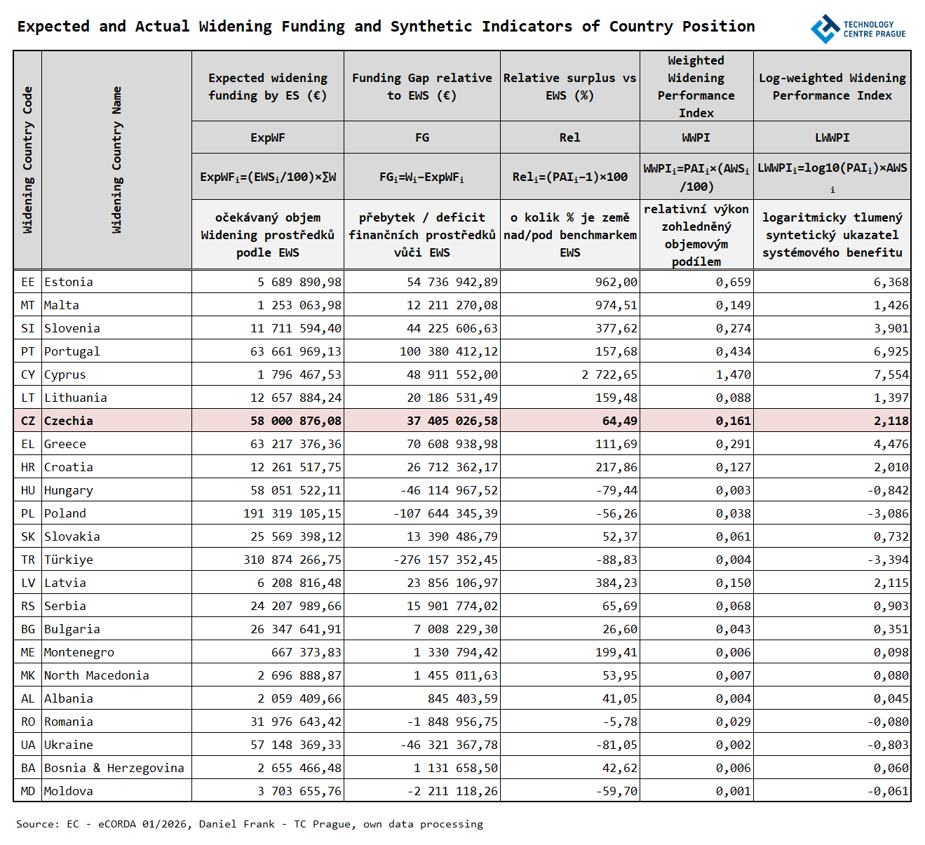 Z tohoto důvodu byly do analýzy doplněny dva syntetické ukazatele: vážený wideningový výkon (Weighted Widening Performance Index, WWPI) a logaritmicky tlumený vážený wideningový výkon (Log-weighted Widening Performance Index, LWWPI). Oba ukazatele tedy zohledňují nejen to, zda země získává více nebo méně, než by odpovídalo očekávání, ale i to, zda se tento rozdíl týká velkého, nebo naopak jen velmi malého objemu finančních prostředků. Díky tomu lépe vystihují, které země mají ve Wideningu nejen vysoký relativní výkon, ale i skutečně významnou pozici z hlediska celkového rozdělení finanční podpory.