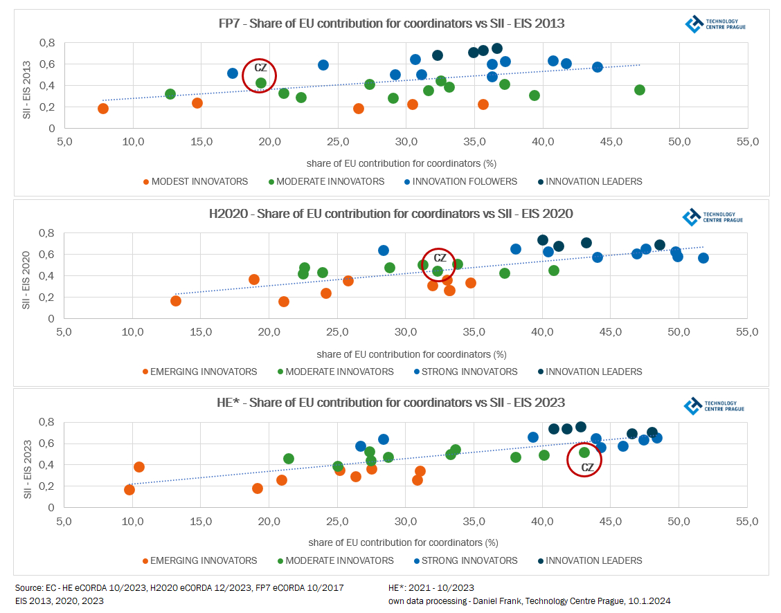 Provedená analýza naznačuje, že význam koordinace projektů pro účast ČR v RP roste. Koordinátoři z ČR se významně podílejí na celkové finanční bilanci ČR v programu HE. Zatímco v 7. RP se české výzkumné týmy a jednotlivci účastnili projektů RP spíše jako členové řešitelských konsorcií, případně jako koordinátoři individuálně zaměřených projektů závěr programu programu H2020, a zejména dosavadní průběh programu HE ukazují, že se situace pozvolna mění a české výzkumné instituce se ve vyší míře pouštějí také do vedení větších konsorciálních projektů. České výzkumné týmy i jednotlivci se stále častěji prosazují v projektech programu HE jako jejich lídři. Zejména stoupá podíl finanční podpory, kterou si čeští koordinátoři nárokují z projektů s vyššími výzkumnými a inovačními ambicemi (RIA, IA projekty). Zatímco v 7. RP české instituce koordinovaly pouze 10 kolaborativních CP projektů (předchůdce typu projektu RIA/IA), v celém programu H2020 21 RIA a IA projektů, v první třetině ČR koordinuje již 22 RIA/IA projektů. V 7. RP získali v ČR hlavní řešitelé 11 ERC grantů, v programu H2020 38 grantů ERC, v období 2021–2023 programu HE již 31 grantů ERC. Standardně dobře si ČR vede v programu HE v prioritě SEWP cílené na účast widening zemí.