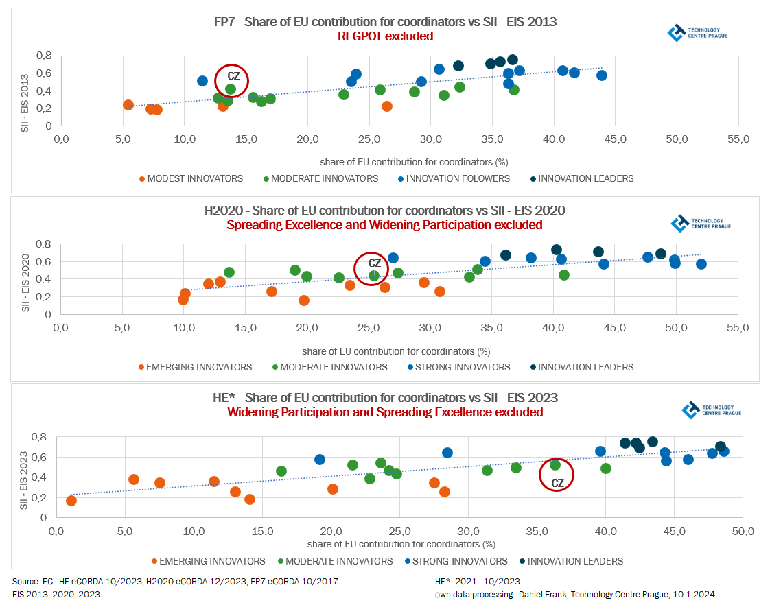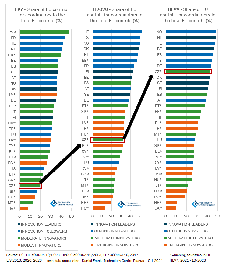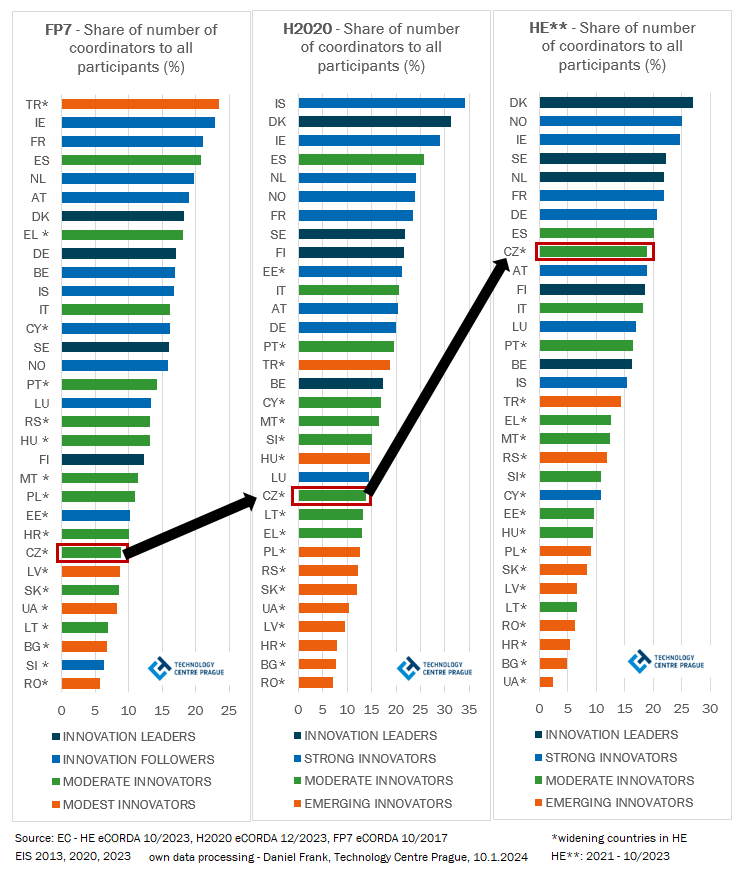 Nové členské státy (NČS – EU13), mezi které patří i ČR, a další státy s nižším inovačním a výzkumným potenciálem, tzv. widening země, se mohou na rozdíl od ostatních států účastnit jako koordinátoři speciální priority programu HE, která slouží ke snižování přetrvávajících rozdílů ve výkonnosti výzkumu a inovací – Rozšiřování účasti a šíření excelence (Widening Participation and Spreading Excellence - SEWP). Podobně tomu bylo také v programu H2020, kde existovala pro výše uvedené účely téměř totožná priorita s podobným názvem Šíření excelence a rozšiřování účasti (Spreading Excellence and Widening Participation – SEWP). V 7. RP byla pro méně rozvinuté regiony EU, kam regiony widening zemí většinou patřily, k dispozici priorita Regiony znalostí (REGPOT). Tato priorita se zaměřovala na rozvoj výzkumných a technologických kapacit vybraných výzkumných institucí z méně rozvinutých – konvergenčních regionů EU a jejich spolupráci s centry excelence v EU. Tyto priority s teritoriální preferencí směrem k méně rozvinutým zemím samozřejmě pozitivně ovlivnily a ovlivňují jejich účast v RP a možnost koordinace projektů RP, neboť výzkumně a inovačně silné státy projekty financované z těchto priorit zpravidla koordinovat nemohly a nemohou. Z tohoto důvodu jsou u tzv. widening zemí pozitivně ovlivněny velikosti podílů koordinátorů k celkové účasti v RP a podíly finanční podpory pro koordinátory k celkové finanční podpoře pro všechny účastníky projektů RP, které byly prezentovány ve výše uvedených analytických a grafických výstupech. Pokud bychom hypoteticky v 7. RP nezahrnuli do analýzy prioritu REGPOT a v programech H2020 a HE prioritu SEWP (graf 2b), došlo by u většiny „widening zemí“ ke snížení podílu počtu koordinátorů k celkovému počtu účastníků a ke snížení podílu finanční podpory pro koordinátory vůči celkové podpoře pro všechny účastníky. V případě ČR by se v 7. RP snížil podíl finanční podpory pro koordinátory z cca 19 % na cca 14 %, v programu H2020 z cca 32 % na cca 25 % a v programu HE z cca 43 % na cca 36 %. Hodnotami podílu počtu koordinátorů by se ČR více vzdálila zemím klasifikovaným jako inovační lídři a silní inovátoři. I tak je u ČR vidět veliký progres ve významu koordinátorů pro účast v RP, což znamená, že změna intenzity koordinace projektů RP není u ČR spojena jen výhradně s projekty tzv. wideningu.