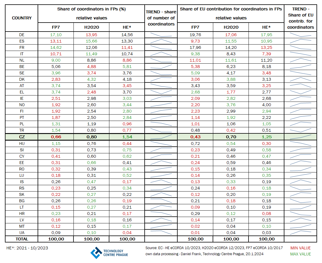 V souvislosti s výše uvedenými úvahami lze po provedené analýze konstatovat, že se podíl koordinátorů projektů z ČR v rámcových programech (RP) v čase zvětšuje. To je možné usuzovat z dat uvedených v tabulkách 1 a 2. V tabulce 1 jsou uvedeny u 32 zemí a pro tři RP (7. RP, H2020, HE) podíly počtu koordinátorů projektů dané země k celkovému počtu koordinátorů projektů ve sledovaných zemích a obdobně podíly finanční podpory určené pro koordinátory projektů z dané země k celkové podpoře, kterou si nárokovali koordinátoři projektů ze všech sledovaných zemí. V případě ČR byl v 7. RP podíl počtu českých koordinátorů projektů vůči celkovému počtu koordinátorů ve 32 zemích 0,66 %, v programu H2020 – 0,80 % a v dosavadním průběhu programu HE - 1,54 %. V případě podílů finanční podpory pro koordinátory projektů z ČR k celkové podpoře pro všechny koordinátory projektů z daných evropských zemí je následující: 7. RP – 0,43 %, H2020 – 0,70 % a HE – 1,25 %. Dle nárůstů těchto podílů lze usuzovat, že se význam koordinátorů projektů pro účast ČR v RP v čase zvyšuje.