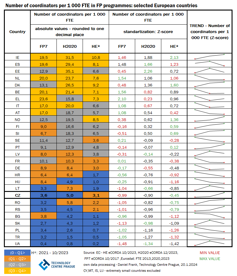 Další alternativou, jak posoudit trend koordinace projektů v jednotlivých evropských zemích, je přepočítat počet koordinátorů projektů na 1 000 FTE výzkumných pracovníků v jednotlivých RP. Získané hodnoty, resp. počty koordinátorů na 1 000 FTE výzkumníků v daném RP pak můžeme rozdělit do skupin dle hodnot příslušných kvartilů. V případě ČR je vidět, že v 7. RP a programu H2020 patřily počty koordinátorů na 1 000 FTE do prvního kvartilu, zatímco v programu HE se u ČR hodnota počtu koordinátorů na 1 000 FTE přesunula do druhého kvartilu. To znamená, že si ČR v porovnání s ostatními zeměmi v programu HE své postavení vylepšila. Při posuzování pořadí států zaujímala ČR v tomto ukazateli v 7. RP a v programu H2020 21. místo mezi 28 sledovanými státy. V programu HE patří ČR 17. místo, kde ji předstihuje v počtu koordinátorů na 1 000 FTE pět widening států – Řecko, Estonsko, Slovinsko, Portugalsko a Lotyšsko. Pro porovnání - v 7. RP předstihovalo ČR osm widening států - Řecko, Estonsko, Portugalsko, Maďarsko, Lotyšsko, Slovinsko, Chorvatsko a Bulharsko, v programu H2020 sedm widening států – Estonsko, Slovinsko, Řecko, Portugalsko, Lotyšsko, Chorvatsko a Rumunsko. Estonsko, Bulharsko, Chorvatsko a Rumunsko, které předstihly ČR v počtu koordinátorů na 1000 FTE výzkumníků alespoň v jednom RP, však mají koordinaci projektů založenou zejména na řízení projektů financovaných z výzev specifických priorit Rozšiřování účasti a šíření excelence – SEWP v programu H2020 a HE či Regionální potenciál – REGPOT v 7. RP.