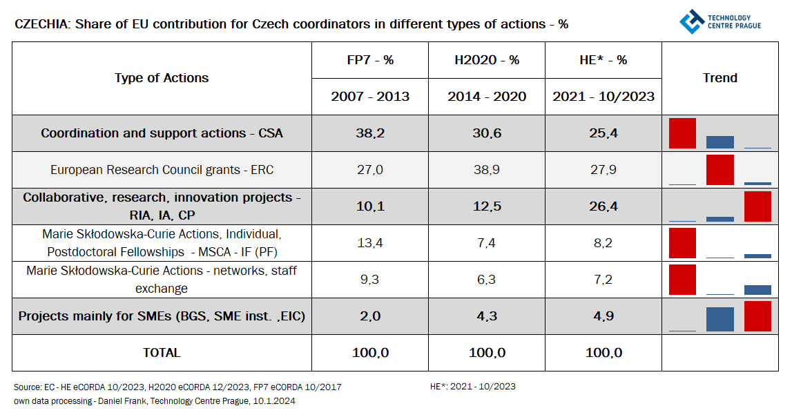Pokud se zaměříme na strukturu finanční podpory českých koordinátorů dle jednotlivých typů akcí v RP, lze v čase pozorovat určité změny této struktury. Je patrné, že od 7. RP k programu HE klesá podíl finanční podpory získané českými koordinátory, kteří vedli koordinační a podpůrné akce, a naopak stoupá podíl finanční podpory, kterou si nárokovali čeští koordinátoři projektů s vyššími výzkumnými a inovačními ambicemi (CP, RIA, IA projekty). Vysoké podíly finanční podpory získávají mezi všemi českými koordinátory hlavní řešitelé velkoryse financovaných grantů ERC. Vzestupný trend mají také podíly finanční podpory pro české koordinátory u projektů určených z velké části pro MSP. Zde je však pozitivní trend růstu finanční podpory ovlivněn do značné míry charakterem speciálních schémat projektů pro tento typ subjektů – např. SME instrument v programu H2020. Výsledné poměry mohou být také ovlivněny nekompletností dat pro granty EIC v programu HE. Klesající tendenci mají finanční podíly pro koordinátory individuálních projektů zaměřených na výzkumnou mobilitu – MSCA – IF (PF). Podrobněji tabulka 3.
