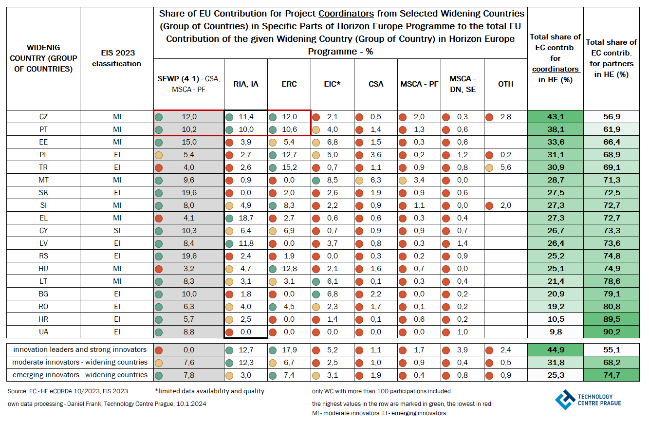 Uspokojivé využívání příležitostí pro koordinaci projektů určených ke snižování přetrvávajících rozdílů ve výkonnosti výzkumu a inovací, relativní úspěch při získávání ERC grantů a větší úspěšnost při koordinaci projektů většího rozsahu zaměřené na výzkum a inovace (tzv. RIA a IA projektů) jsou klíčovými faktory, kterými se ČR v programu HE odlišuje od většiny ostatních widening zemí, a naopak se přibližuje k zemím s vyšším výzkumným a inovačním potenciálem.