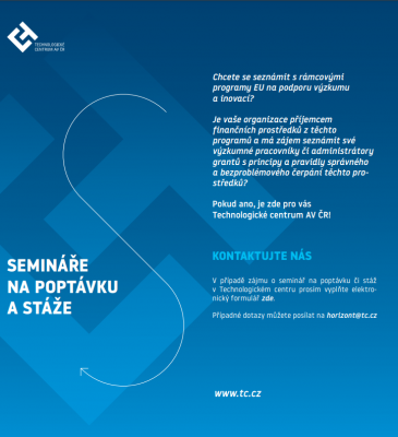 Leták upozorňuje na možnost uspořádání seminářů či stáží zaměřených na program Horizont Evropa šitých na míru poptávající instituci.
