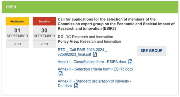 Podrobné informace jsou na adrese výzvy: Call for applications for the selection of members of the Commission expert group on the Economic and Societal Impact of Research and innovation (ESIR3)