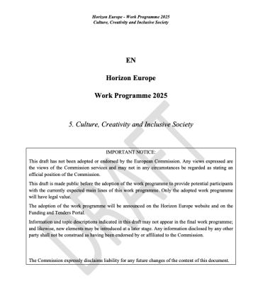 Evropská komise zveřejnila 25. dubna 2025 drafty Pracovních programů Horizontu Evropa pro rok 2025. Jde o předběžné znění hlavního pracovního programu a doplňujících pracovních programů pro jednotlivé oblasti Horizontu Evropa. Mezi nimi je i Pracovní program pro Klastr 2 – Kultura, kreativita a inluzivní společnost. Jeho schválení a otevření prvních výzev se předpokládá 15. května 2025. Ve stejný den pořádá od 9:30 Evropská komise online informační setkání. Zde budou jednotlivé výzvy představeny a bude možné pokládat dotazy.