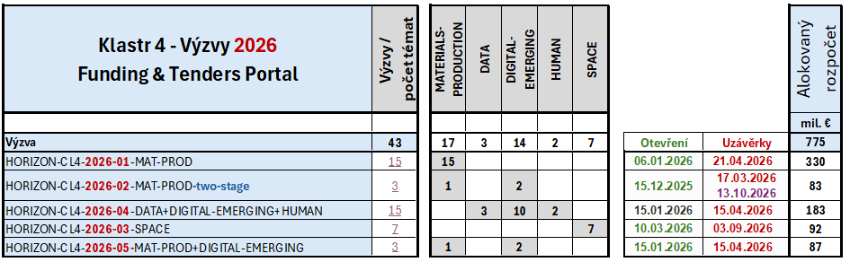 V současné době jsou otevřeny výzvy klastru 4 na ro rok 2026. Odkazy na jednotlivá témata ve Fuding and Tenders potálu EK uspořádané podle Destinations pracovního programu najdete zde.