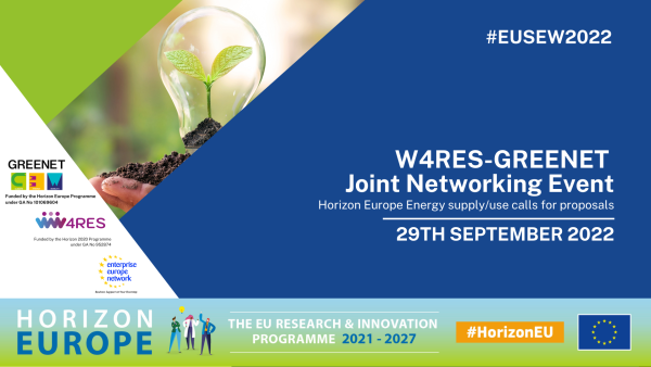 In the framework of the European Sustainable Energy Week 2022 (#EUSEW2022) GREENET, the network of HE cluster 5 National Contact Points, the H2020 project W4RES, Women for for market uptake of renewable heating and cooling, and EEN are organising a Joint Networking Event on the Horizon Europe (HE) energy supply/use-related calls for proposals, which will open on the 6th September 2022 and will close in January 2023 (the specific topics are available here: https://energy-networking-event.b2match.io/page-4251).