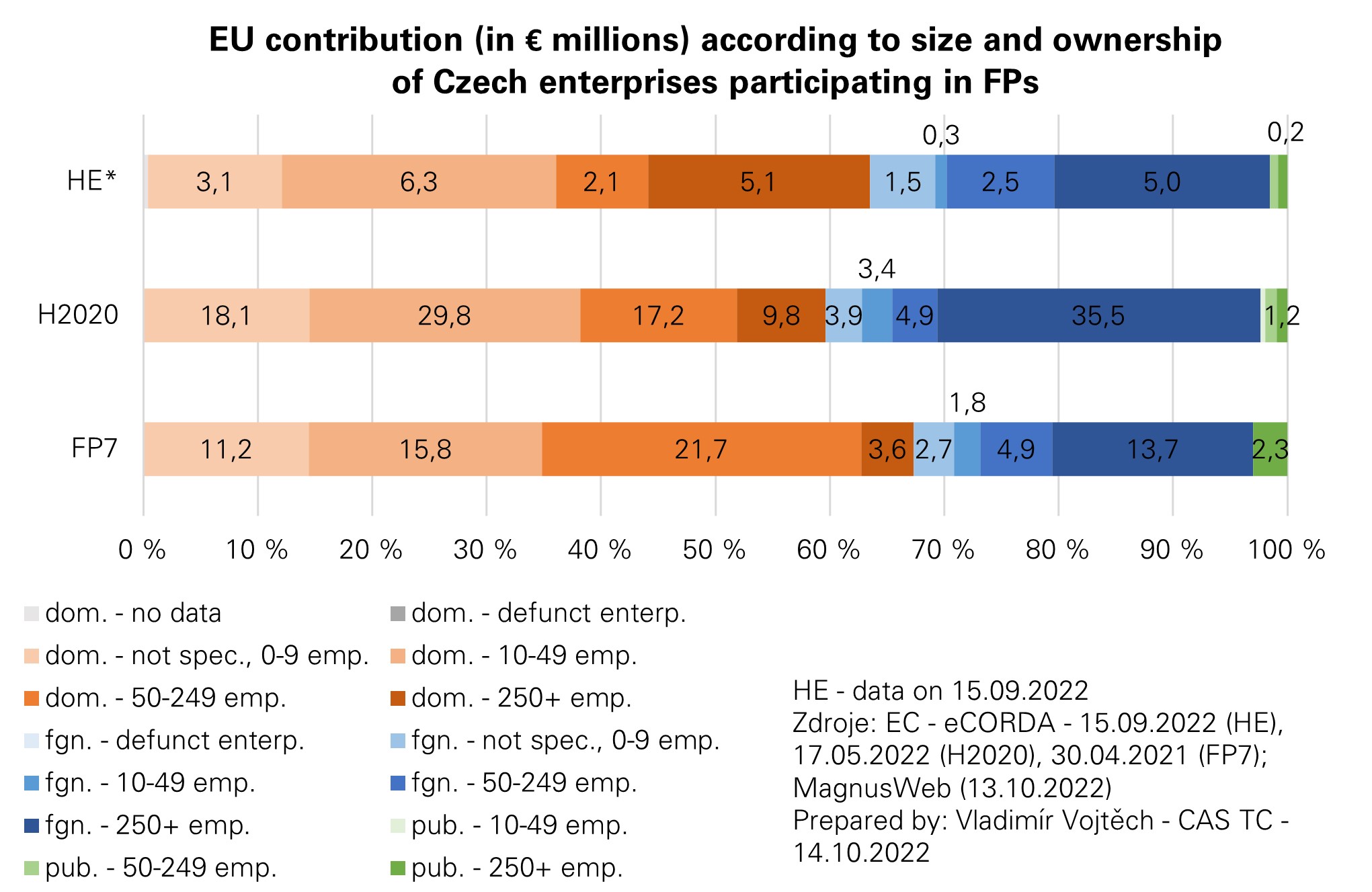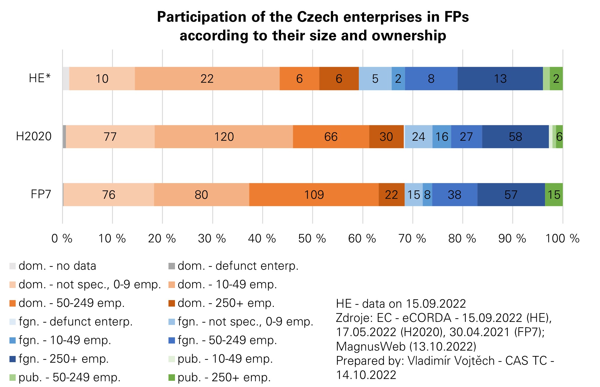 The previous post from October 12, 2022, briefly evaluated the sectoral structure of the participation of Czech companies in Framework Programmes. The aim of this contribution is to continue and present to the reader the size structure of these enterprises according to the number of employees. The aspect of the institutional sector, or ownership, is also added, as domestic and foreign enterprises of different size categories participate in the Framework Programmes. Again, only participants of the "beneficiary" type, who have signed a grant agreement with the European Commission or are preparing to sign it are evaluated. Since we evaluate three consecutive Framework Programmes, the size category of the enterprise at the time of the end of the programme is decisive. This means 2014 for the 7th Framework Programme, 2000 for the Horizon 2020 programme, as the MagnusWeb database, operated by Dun & Bradstreet Czech Republic, a.s., does not have data from the financial statements of the participating enterprises for the year 2021 at the time of writing this post. In the case of the current Horizon Europe programme, we also use data for 2020.
