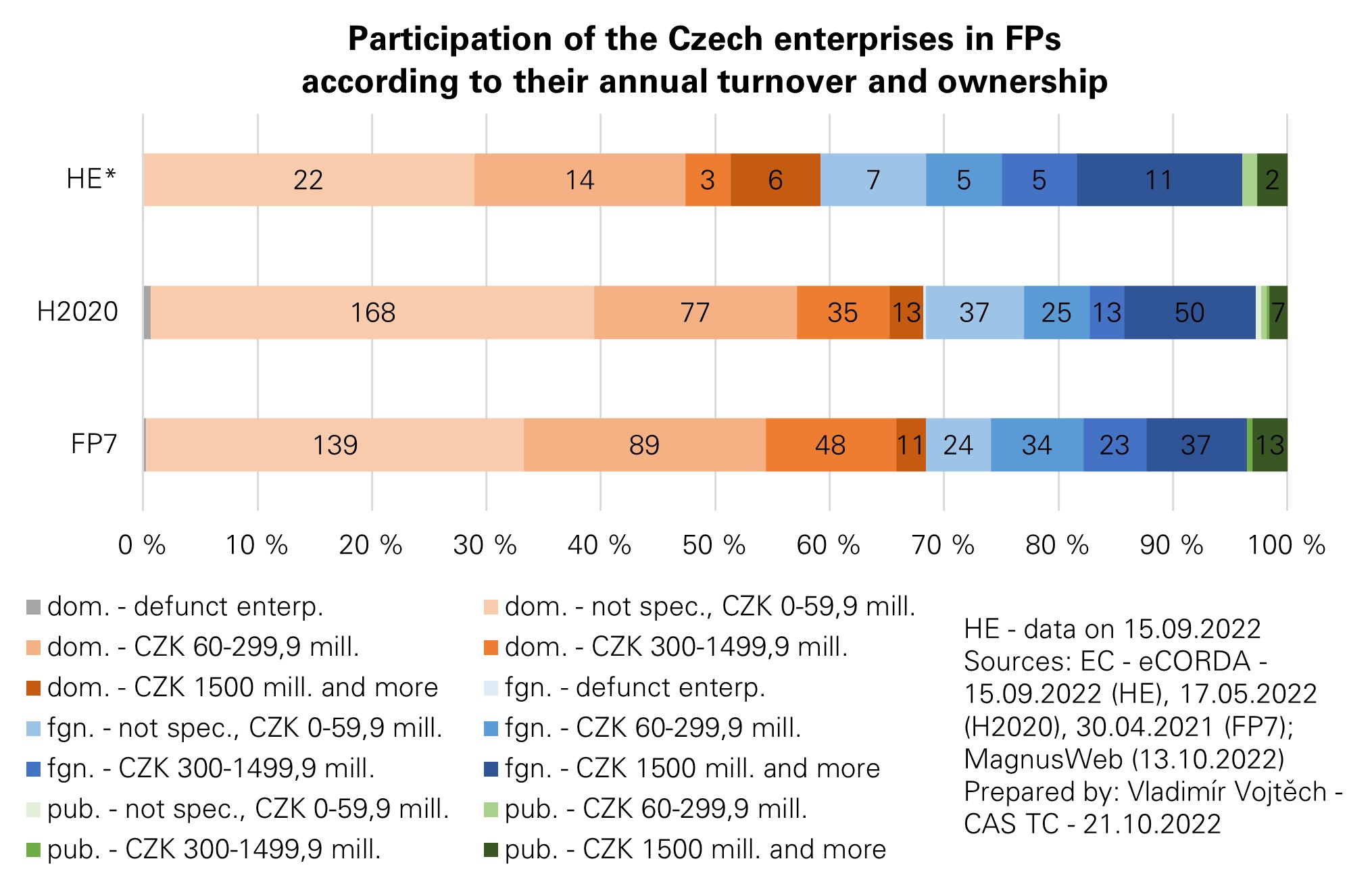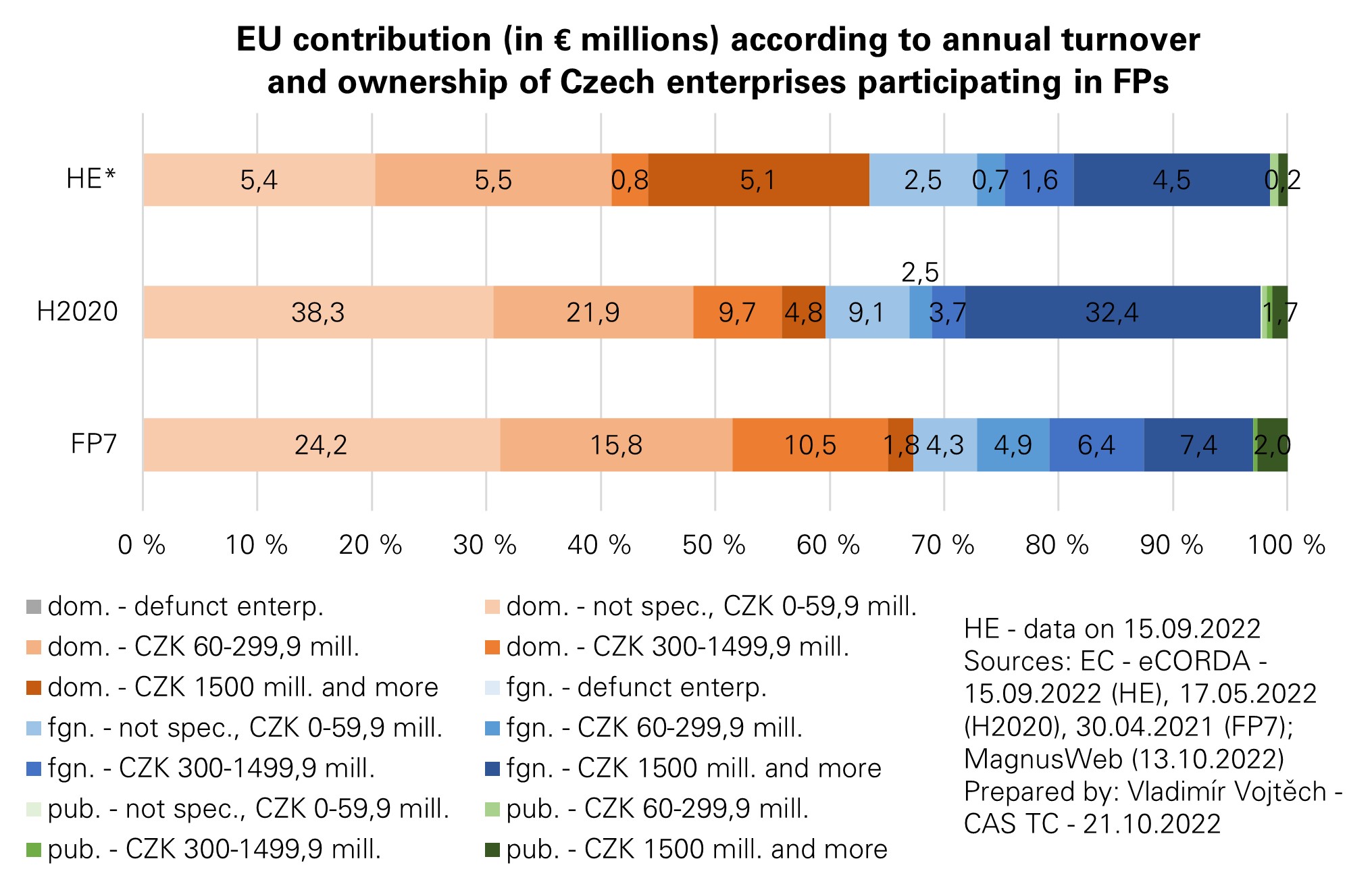 The contribution from October 14, 2022 was focused on brief evaluation of size of the domestic enterprises participating in Framework Programmes according to the number of their employees. Aim of this contribution is to continue and present the reader the size structure of these enterprises according to their annual turnover. Again, the point of view of the institutional sector (i.e. ownership) is added, as even in the criterion of the turnover is valid, that that domestic and foreign enterprises of different size categories participate in the Framework Programmes. Only participants of the "beneficiary" type, who have signed a grant agreement with the European Commission or are preparing to sign it are evaluated. Since three consecutive Framework Programmes are evaluated, the size category of the enterprise at the time of the end of the programme is decisive for us. This means 2014 for the 7th Framework Programme, 2000 for the Horizon 2020 programme, as the MagnusWeb database, operated by Dun & Bradstreet Czech Republic, a.s., does not have data from the financial statements of the participating enterprises for the year 2021 at the time of writing this post. In the case of the current Horizon Europe programme, we also use data for 2020.