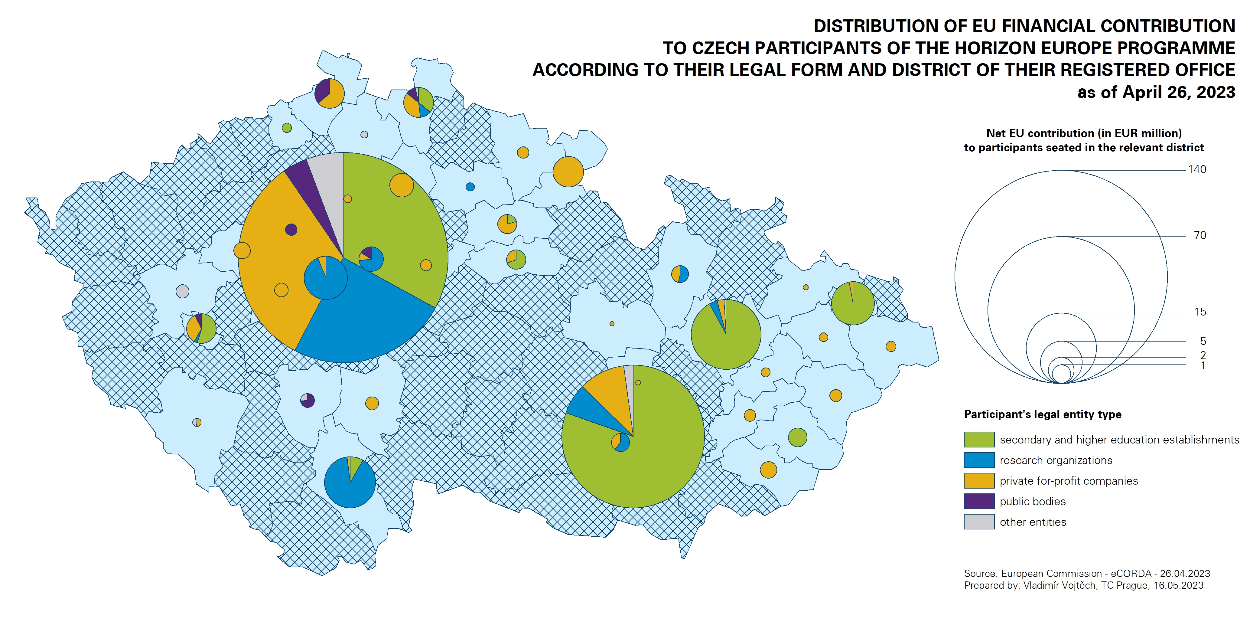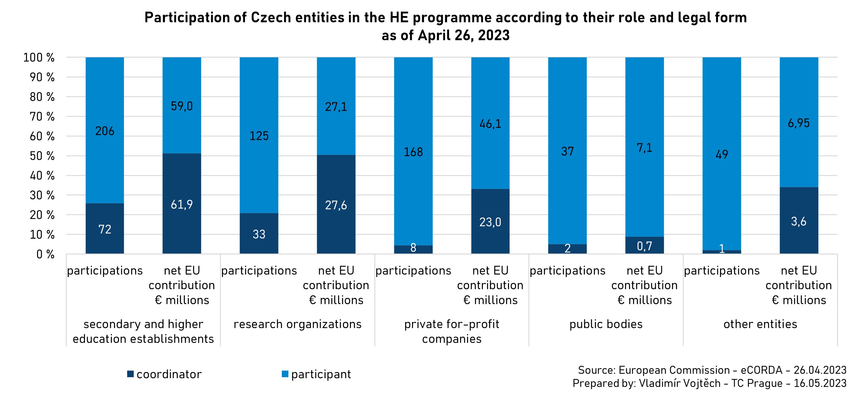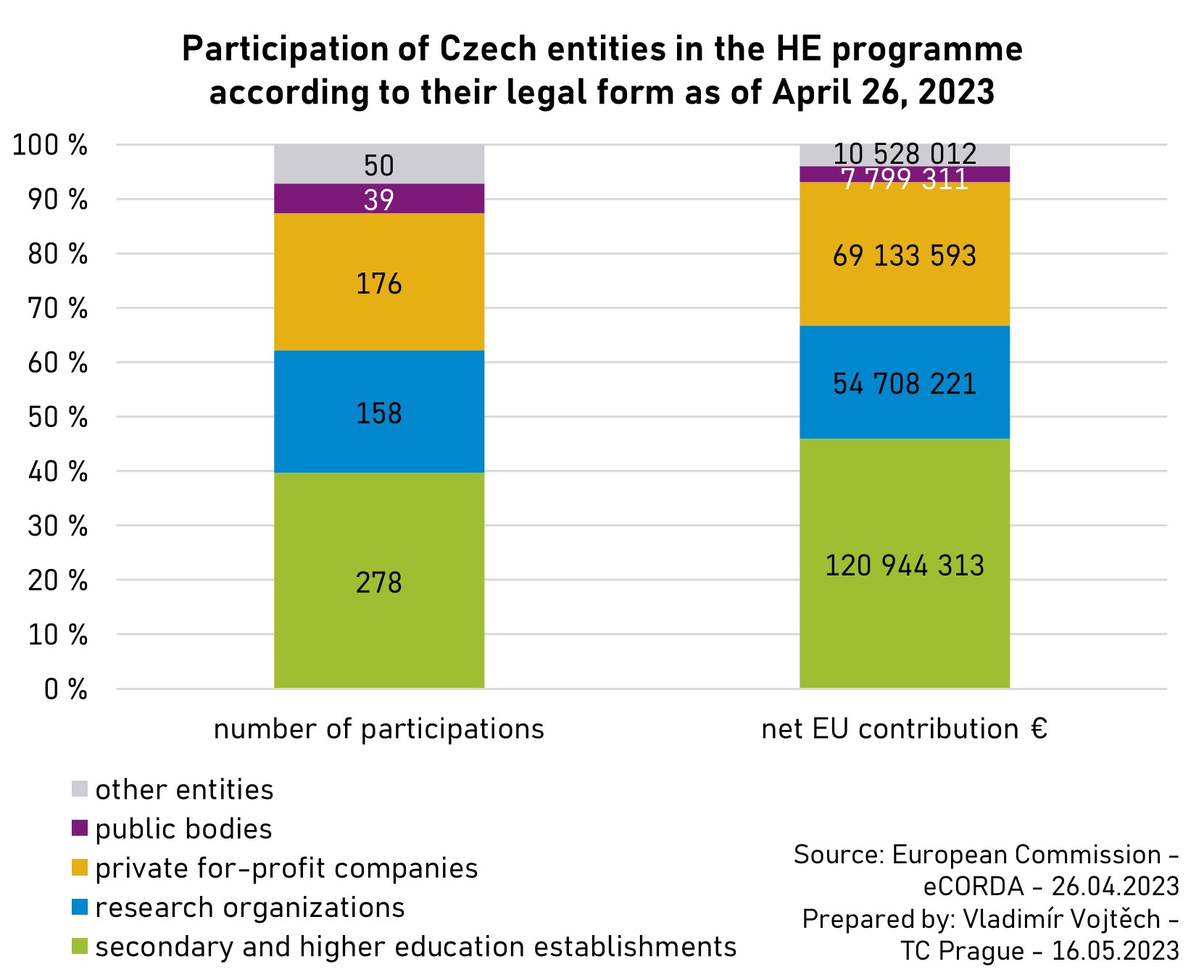 The May 8, 2023 post inter alia informed that as of April 26, 2023, entities from the Czech Republic reported 701 participations in the Horizon Europe programme (hereafter "HE") and claimed a net EU contribution of €263 million. The aim of this contribution is to follow up and describe the structure of Czech entities participating in the HE programme from the point of view of their legal form.