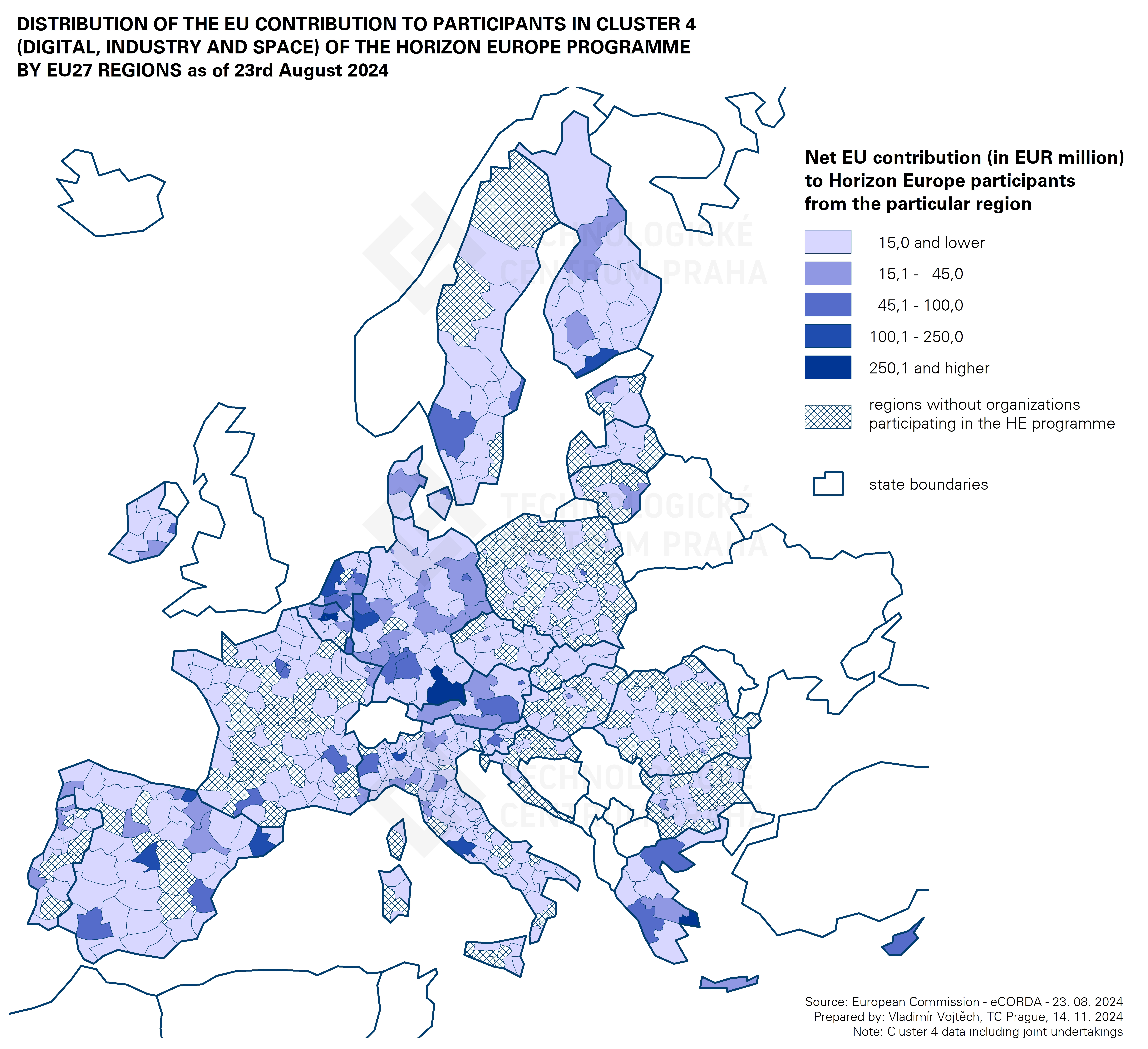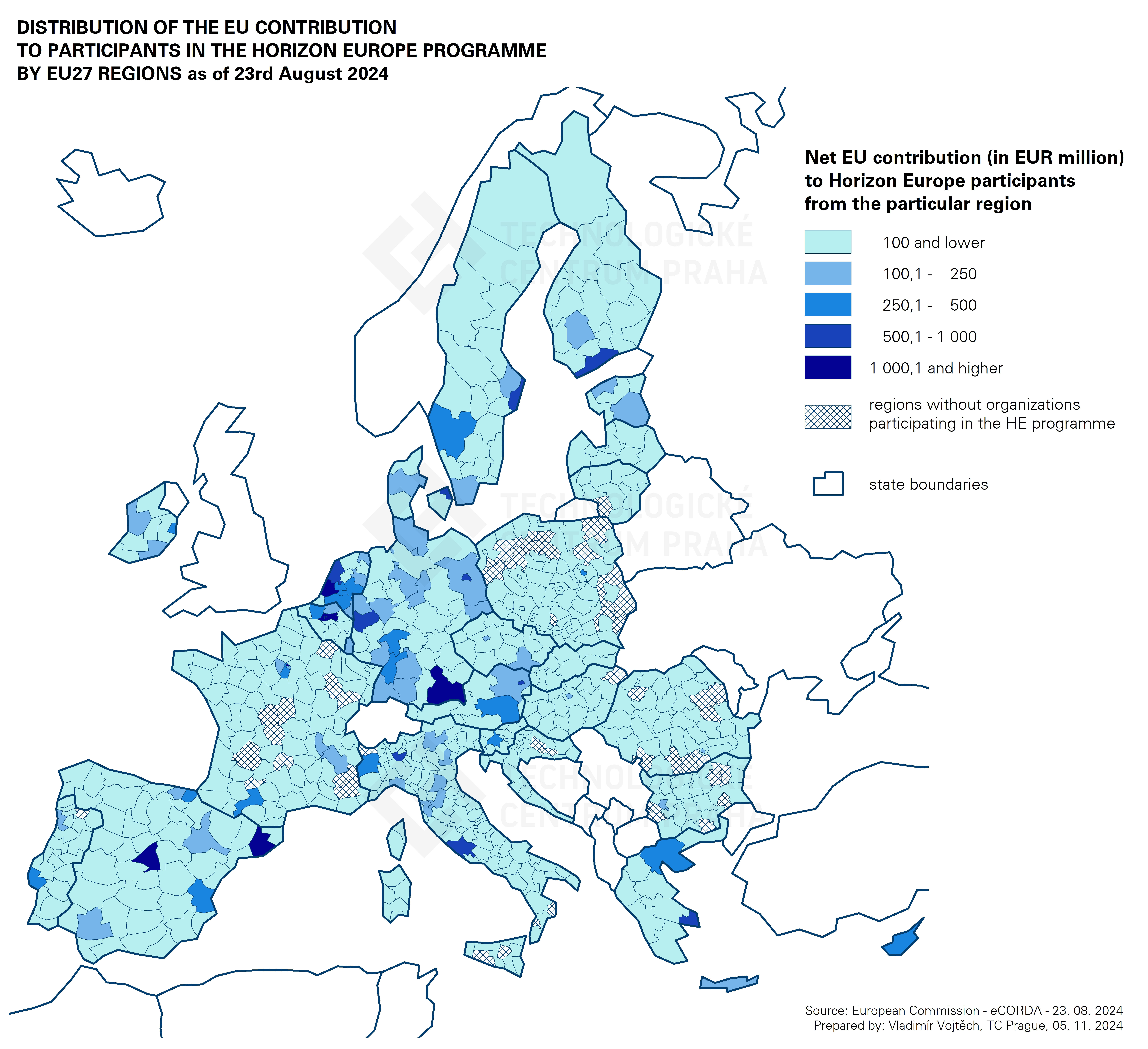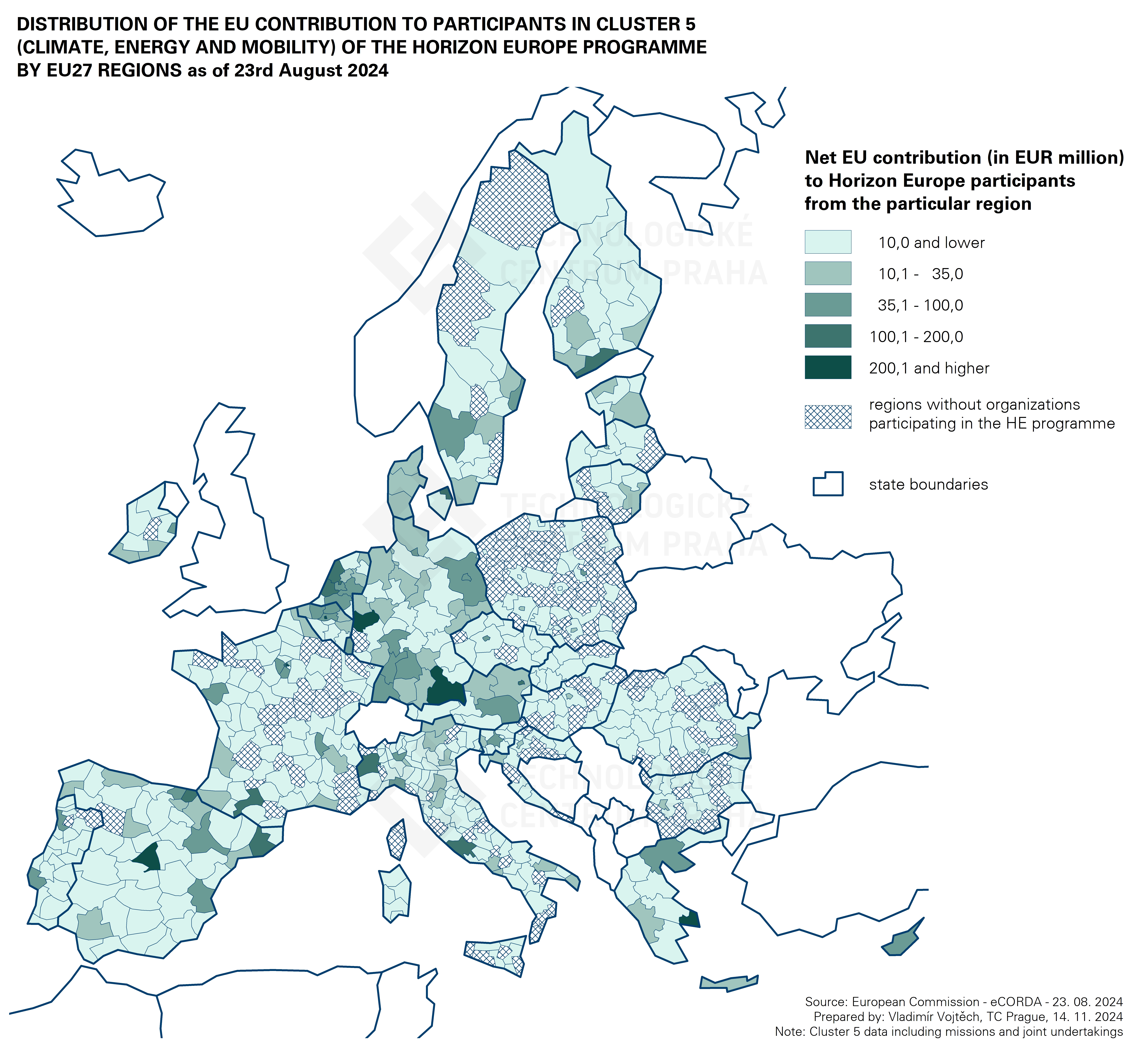 Until now, we have assessed participation in Horizon Europe on a country-by-country basis. So let us take a deeper look at the participation of individual regions of the EU Member States. We have prepared 7 maps – the first one for the whole Horizon Europe programme, the other 6 for the individual clusters of HE’s Pillar II. For example, you will see that the highest EU contribution (as of 23 August 2024) is claimed by participants from the largest cities as natural centres of research, development, innovation, entrepreneurship and cultural life. Among the EU regions, Paris ranked first (3.6 thousand funded participations with a net EU contribution of €2.3 billion claimed), followed by the regions of Munich (Upper Bavaria - 2.3 thousand funded participations and €1.8 billion) and Barcelona (2.9 thousand funded participations and €1.4 billion). In fourth place was the Brussels hinterland province of Flemish Brabant (1,000 funded participations and €1.3 billion). More than €1 billion of the net EU contribution was also claimed by participants directly from Brussels, the Madrid region and South Holland (Rotterdam and The Hague region). Participants from these 7 regions claimed almost a quarter of the total net EU contribution.