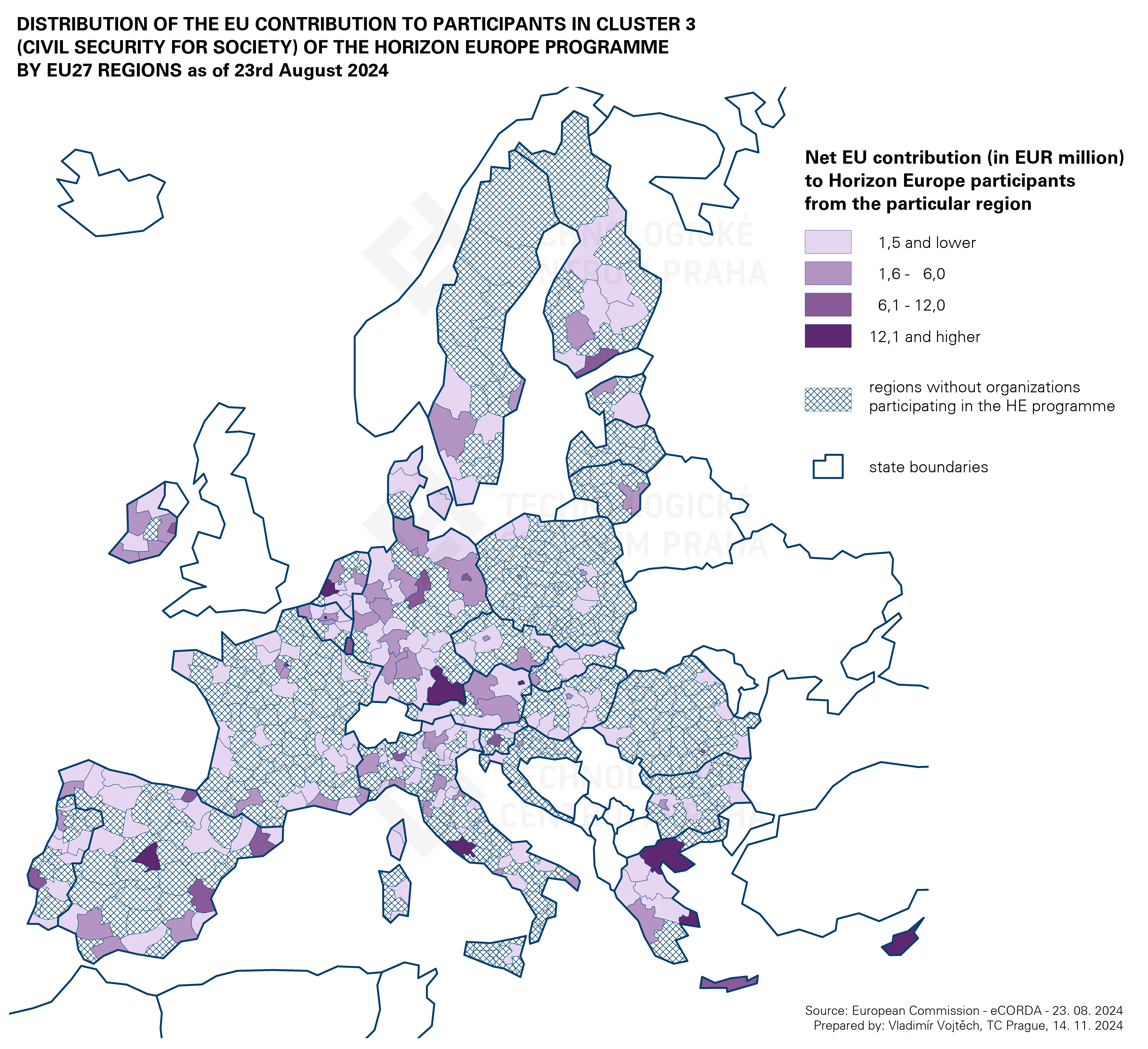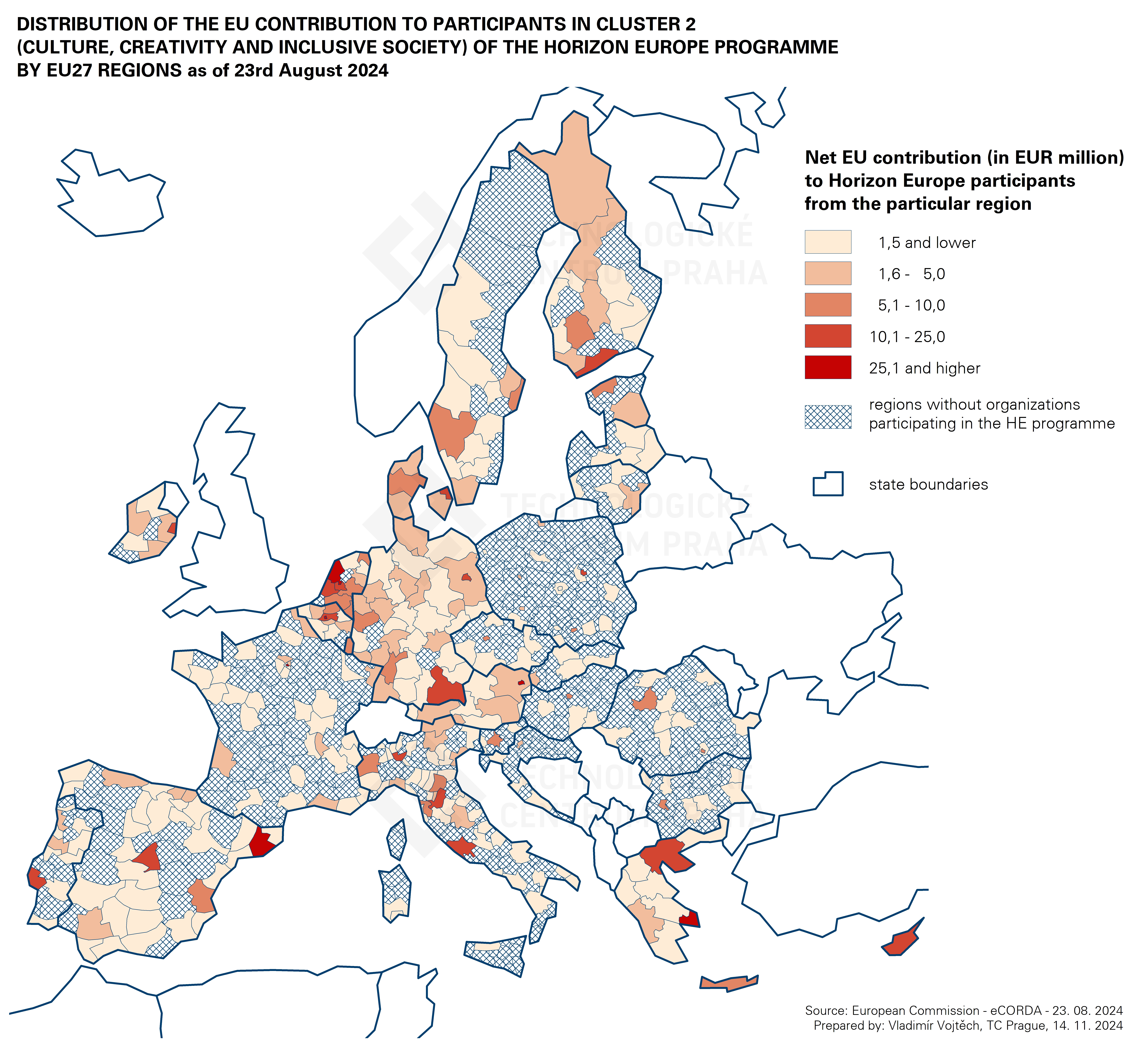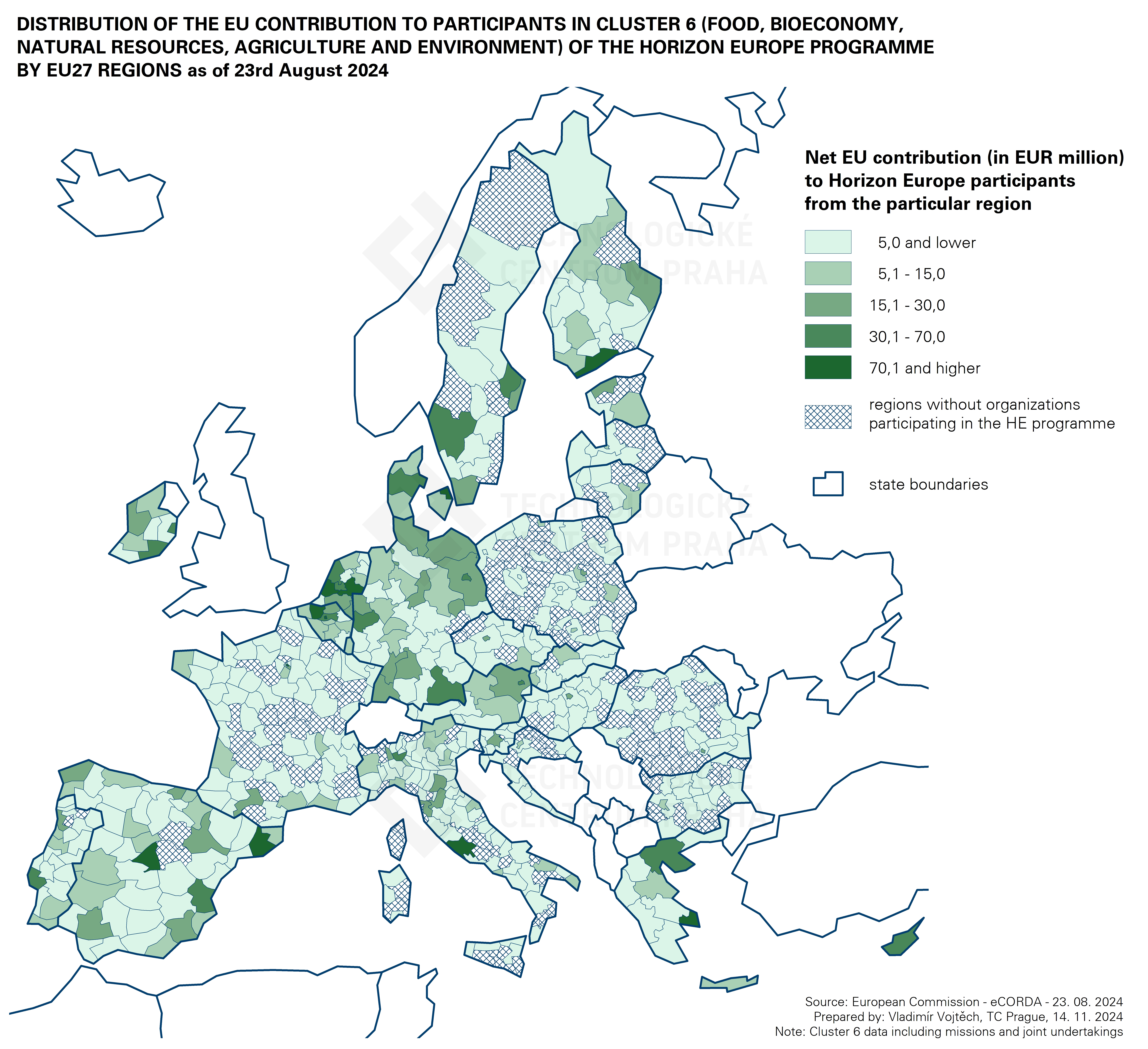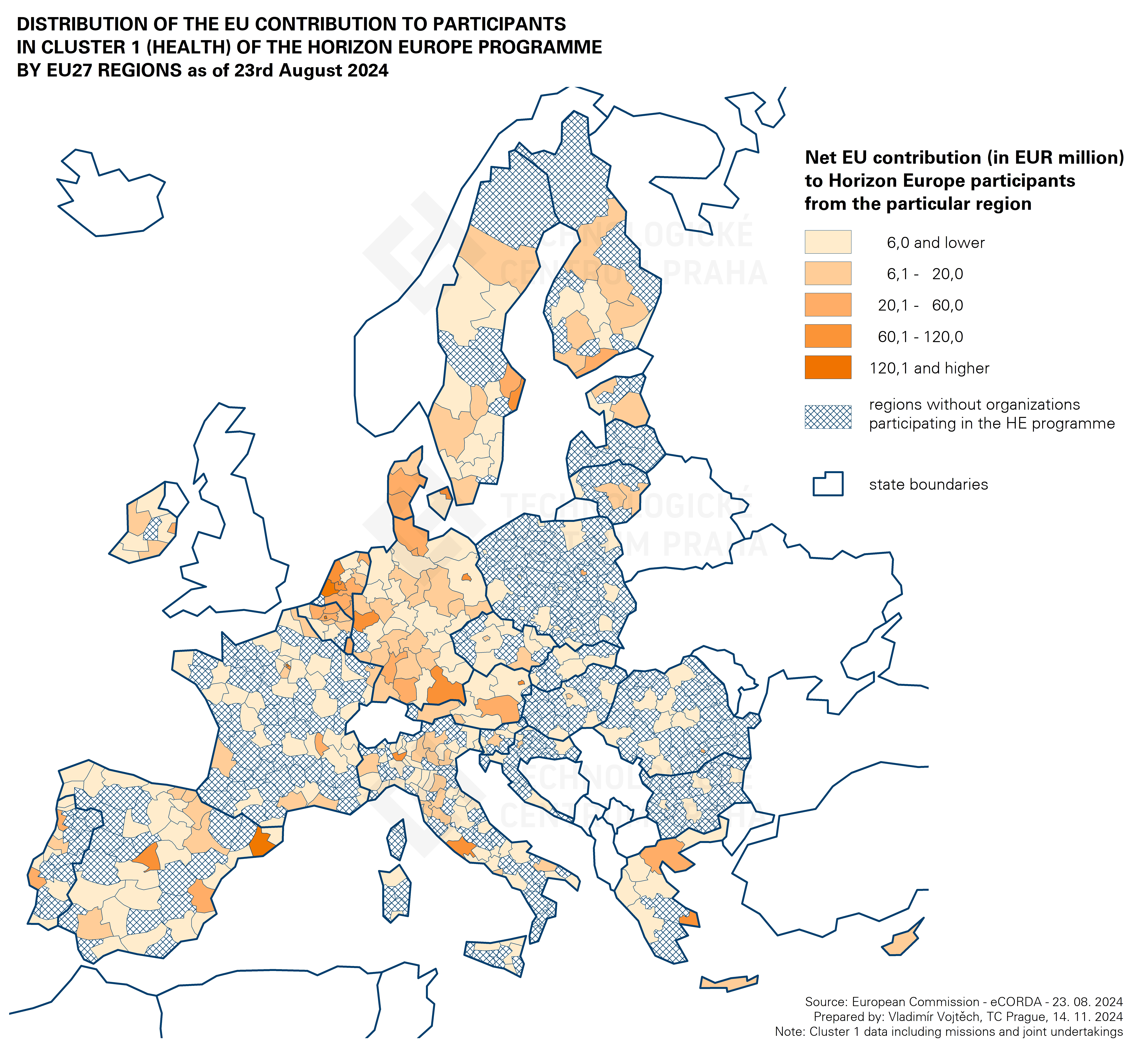 Until now, we have assessed participation in Horizon Europe on a country-by-country basis. So let us take a deeper look at the participation of individual regions of the EU Member States. We have prepared 7 maps – the first one for the whole Horizon Europe programme, the other 6 for the individual clusters of HE’s Pillar II. For example, you will see that the highest EU contribution (as of 23 August 2024) is claimed by participants from the largest cities as natural centres of research, development, innovation, entrepreneurship and cultural life. Among the EU regions, Paris ranked first (3.6 thousand funded participations with a net EU contribution of €2.3 billion claimed), followed by the regions of Munich (Upper Bavaria - 2.3 thousand funded participations and €1.8 billion) and Barcelona (2.9 thousand funded participations and €1.4 billion). In fourth place was the Brussels hinterland province of Flemish Brabant (1,000 funded participations and €1.3 billion). More than €1 billion of the net EU contribution was also claimed by participants directly from Brussels, the Madrid region and South Holland (Rotterdam and The Hague region). Participants from these 7 regions claimed almost a quarter of the total net EU contribution.